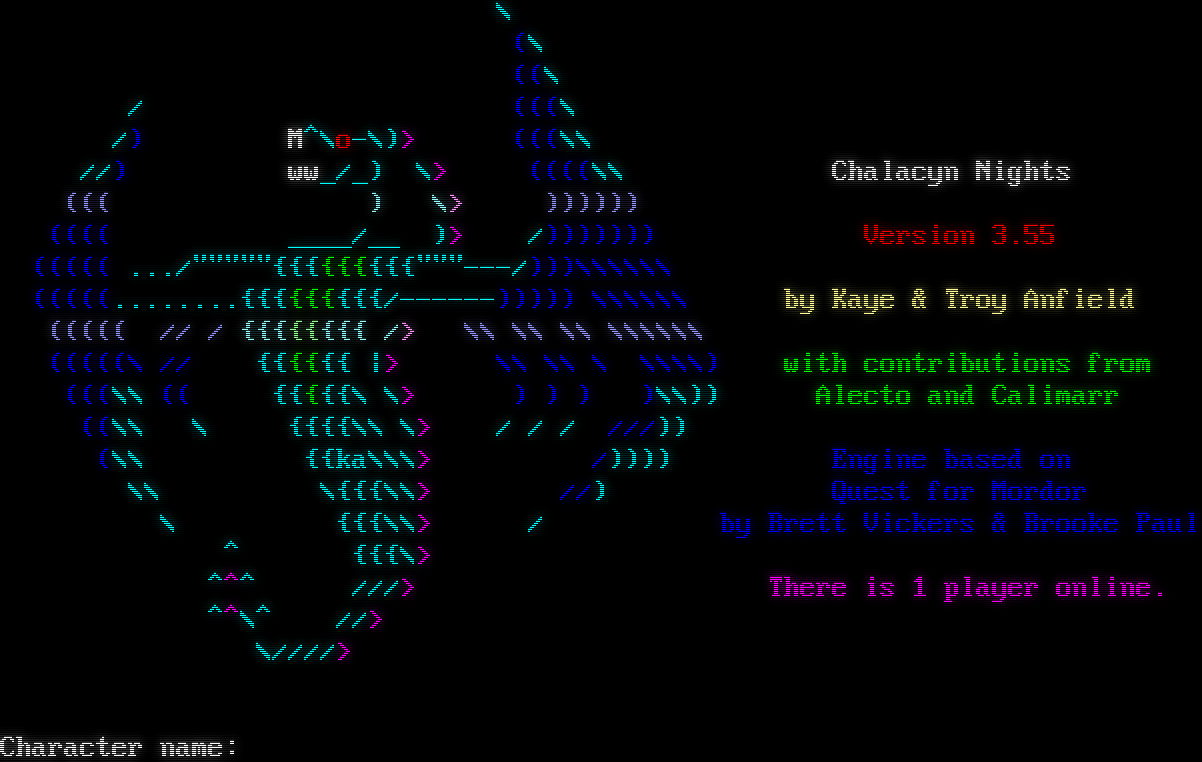 \\ ( (\\ / ) ((\\ / ( / (((\\ /) \\(_ M^\\o-\\)> (((\\\\ //) ww_/_) \\> ((((\\\\ Chalacyn Nights ((( ) \\> )))))) (((( _​___/__ )> /))))))) Version 3.55 ((((( .../"​""""{{{{{{{{{"​""---/)))\\\\\\\\\\\\ (((((.​.......{{{{{{{{{/-​-----))))) \\\\\\\\\\\\ by Kaye & Troy Anfield ((((( // / {{{{{{{{ /> \\\\ \\\\ \\\\ \\\\\\\\\\\\ (((((\\ // {{{{{{ \|> \\\\ \\\\ \\ \\\\\\\\) with contributions from (((\\\\ (( {{{{{\\ \\> ) ) ) )\\\\)) Alecto and Calimarr ((\\\\ \\ {{{{\\\\ \\> / / / ///)) (\\\\ {{ka\\\\\\> /)))) Engine based on \\\\ \\{{{\\\\> //) Quest for Mordor \\ {{{\\\\> / by Brett Vickers & Brooke Paul ^ {{{\\> ^^^ ///> There is 1 player online. ^^\\^ //> \\////> This world is Pueblo 1.10 enhanced.  Character name: