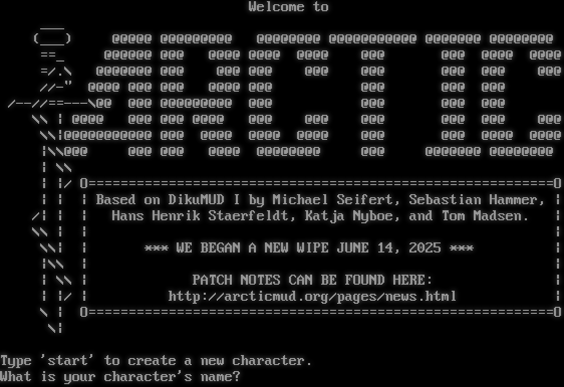 Welcome to ___ (___) @@@@@ @@@@@@@@@ @@@@@@@@ @@@@@@@@@@@ @@@@@@@ @@@@@@@@ ==_ @@@@@@ @@@ @@@@ @@@@ @@@@ @@@ @@@ @@@@ @@@@ =/.\\ @@@@@@@ @@@ @@@ @@@ @@@ @@@ @@@ @@@ @@@ //-" @@@@ @@@ @@@ @@@@ @@@ @@@ @@@ @@@ /--//=​=---\\@@ @@@ @@@@@@@@@ @@@ @@@ @@@ @@@ \\\\ \| @@@@ @@@ @@@ @@@@ @@@ @@@ @@@ @@@ @@@ @@@ \\\\\|@@@@@@@@@@@ @@@ @@@@ @@@@ @@@@ @@@ @@@ @@@@ @@@@ \|\\\\@@@ @@@ @@@ @@@@ @@@@@@@@ @@@ @@@@@@@ @@@@@@@@ \| \\\\ \| \|/ O=​=========================================================O \| \| \| Based on DikuMUD I by Michael Seifert, Sebastian Hammer, \| /\| \| \| Hans Henrik Staerfeldt, Katja Nyboe, and Tom Madsen. \| \\\\ \| \| \| \\\\\| \| \*\*\* WE BEGAN A NEW WIPE JUNE 14, 2025 \*\*\* \| \|\\\\ \| \| \| \\\\ \| PATCH NOTES CAN BE FOUND HERE: \| \| \|/ \| http://arcticmud.org/pages/news.html \| \\ \| O=​=========================================================O \\\| Type 'start' to create a new character. What is your character's name?