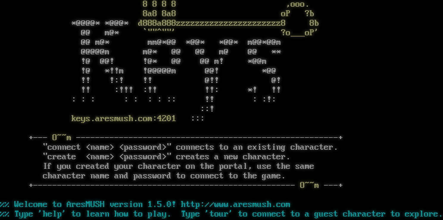 8 8 8 8 ,ooo. 8a8 8a8 oP ?b \*@@@@\* \*@@@\* d888a888zzzzzzzzzzzzzzzzzzzzzz8 8b @@ m@\* \`"​"^""' ?o___oP' @@ m@\* mm@\*@@ \*@@\* \*@@\* m@@\*@@m @@@@@m m@\* @@ @@ m@ @@ \*\* !@ @@! !@\* @@ @@ m! \*@@m !@ \*!!m !@@@@@m @@! \*@@ !! !:! !! @!! @! !! :!!! :!! !!: \*! !! : : : : : : : :: !! : :!: ::! keys.aresmush.com:4201 ::: +​--- O~~m -​------------------------------------------------------+ "connect <name> <password>" connects to an existing character. "create <name> <password>" creates a new character. If you created your character on the portal, use the same character name and password to connect to the game. +​------------------------------------------------------- O~~m -​--+ %% Welcome to AresMUSH version 1.5.0! http://www.aresmush.com %% Type 'help' to learn how to play. Type 'tour' to connect to a guest character to explore.