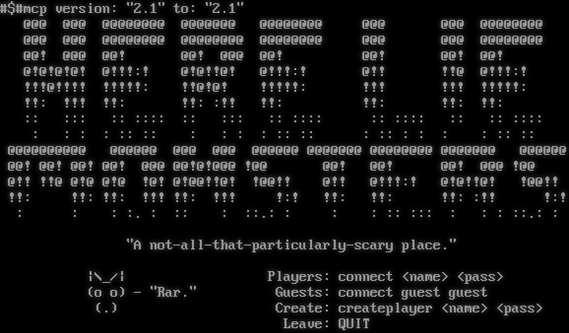 #$#mcp version: "2.1" to: "2.1" @@@ @@@ @@@@@@@@ @@@@@@@ @@@@@@@@ @@@ @@@ @@@@@@@@ @@@ @@@ @@@@@@@@ @@@@@@@@ @@@@@@@@ @@@ @@@ @@@@@@@@ @@! @@@ @@! @@! @@@ @@! @@! @@! @@! @!@!@!@! @!!!:! @!@!!@! @!!!:! @!! !!@ @!!!:! !!!@!!!! !!!!!: !!@!@! !!!!!: !!! !!! !!!!!: !!: !!! !!: !!: :!! !!: !!: !!: !!: :: ::: :: :::: :: ::: :: :::: :: :::: :: :: :::: : : : : :: :: : : : : :: :: : :: : : : : :: :: @@@@@@@@@@ @@@@@@ @@@ @@@ @@@@@@ @@@@@@@ @@@@@@@@ @@@@@@@ @@@@@@ @@! @@! @@! @@! @@@ @@!@!@@@ !@@ @@! @@! @@! @@@ !@@ @!! !!@ @!@ @!@ !@! @!@@!!@! !@@!! @!! @!!!:! @!@!!@! !@@!! !!: !!: !!: !!! !!: !!! !:! !!: !!: !!: :!! !:! : : : :. : :: : ::.: : : : :: ::: : : : ::.: : "A not-all-that-particularly-scary place." \|\\_/\| Players: connect <name> <pass> (o o) - "Rar." Guests: connect guest guest (.) Create: createplayer <name> <pass> Leave: QUIT