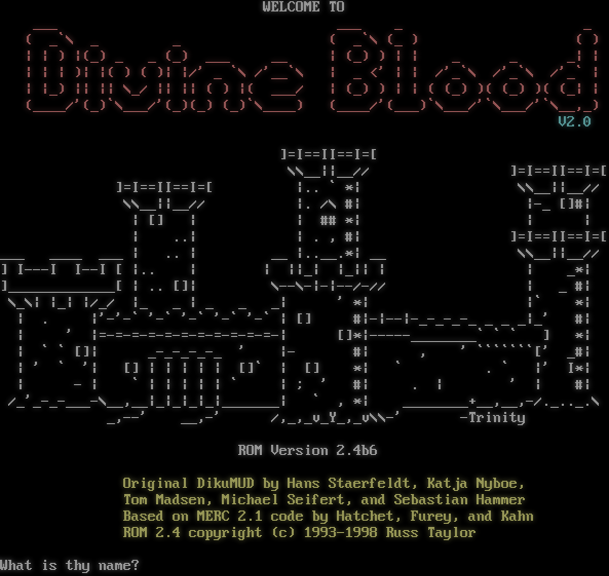 WELCOME TO ___ ___ _ _ ( _\`\\ _ _ ( _\`\\ (_ ) ( ) \| \| ) \|(_) _ _ (_) ___ __ \| (_) ) \| \| _ _ _\| \| \| \| \| )\| \|( ) ( )\| \|/' _ \`\\ /'__\`\\ \| _ <' \| \| /'_\`\\ /'_\`\\ /'_\` \| \| \|_) \|\| \|\| \\_/ \|\| \|\| ( ) \|( ___/ \| (_) ) \| \| ( (_) )( (_) )( (_\| \| (_​___/'(_)\`\\___/'(_)(_) (_)\`\\_​___) (_​___/'(___)\`\\___/'\`\\___/'\`\\__,_) V2.0 ]=I==II==I=[ \\\\__\|\|__// ]=I==II==I=[ ]=I==II==I=[ \|.. \` \*\| \\\\__\|\|__// \\\\__\|\|__// \|. /\\ #\| \|-_ []#\| \| [] \| \| ## \*\| \| \| \| ..\| \| . , #\| ]=I==II==I=[ ___ _​___ ___ \| .. \| __ \|.​.__.\*\| __ \\\\__\|\|__// ] I---I I--I [ \|.. \| \| \|\|_\| \|_\|\| \| \| _\*\| ]_​____________[ \| .. []\| \\--\\-\|-\|--/-// \| _ #\| \\_\\\| \|_\| \|/_/ \|_ _ \| _ _ _\| ' \*\| \|\` \*\| \| . \|'-'-\` '-\` '-\` '-\` '-\` \| [] #\|-\|--\|-​_-_-_-_ _ _ _\|_' #\| \| ' \|=​-=-=-=-=-=-=-=-=-=-=-\| []\*\|-​----________\` \` \` ] \*\| \| \` \` []\| _​-_-_-_-_ ' \|- #\| , ' \`\`\`\`\`\`\`[' _#\| \| ' \` '\| [] \| \| \| \| \| []\` \| [] \*\| \` . \` \|' I\*\| \| - \| \` \| \| \| \| \| \` \| ; ' #\| . \| ' \| #\| /_'_​-_-___-\\__,__\|_\|_\|_\|_\|_​______\| \` , \*\| _​_______+__,__,-/.​_.._.\\ _,--' __,-' /,_,_v_Y_,_v\\\\-' -Trinity ROM Version 2.4b6 Original DikuMUD by Hans Staerfeldt, Katja Nyboe, Tom Madsen, Michael Seifert, and Sebastian Hammer Based on MERC 2.1 code by Hatchet, Furey, and Kahn ROM 2.4 copyright (c) 1993-1998 Russ Taylor What is thy name?