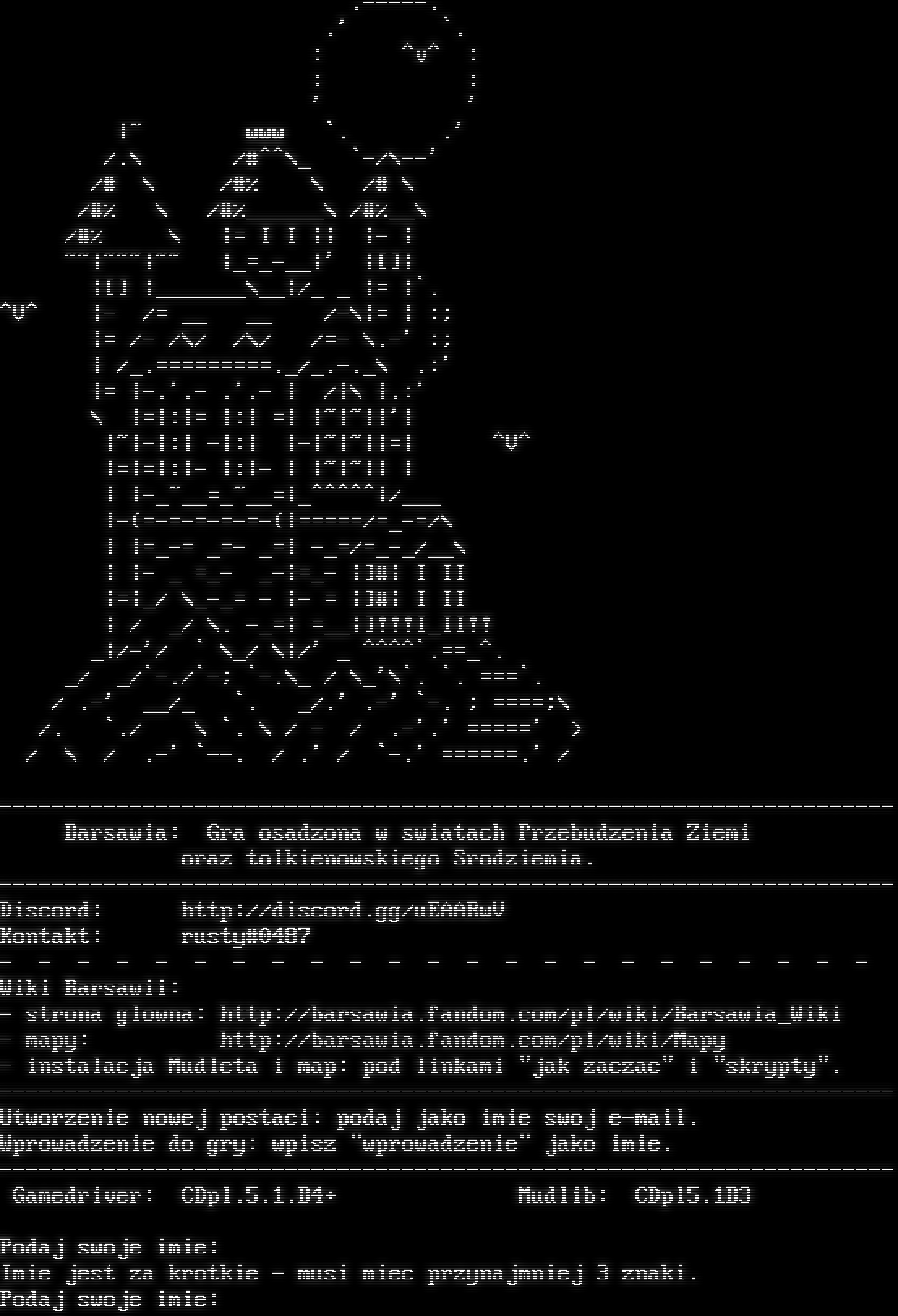 .​-----. .' \`. : ^v^ : : : ' ' \|~ www \`. .' /.\\ /#^^\\_ \`-/\\--' /# \\ /#% \\ /# \\ /#% \\ /#%_​_____\\ /#%__\\ /#% \\ \|= I I \|\| \|- \| ~~\|~~~\|~~ \|_​=_-__\|' \|[]\| \|[] \|_​______\\__\|/_ _ \|= \|\`. ^V^ \|- /= __ __ /-\\\|= \| :; \|= /- /\\/ /\\/ /=- \\.-' :; \| /_​.=========._/_​.-._\\ .:' \|= \|-.'.- .'.- \| /\|\\ \|.:' \\ \|=\|:\|= \|:\| =\| \|~\|~\|\|'\| \|~\|-\|:\| -\|:\| \|-\|~\|~\|\|=\| ^V^ \|=\|=\|:\|- \|:\|- \| \|~\|~\|\| \| \| \|-​_~__=_~__=\|_​^^^^^\|/___ \|-(=​-=-=-=-=-(\|=​====/=​_-=/\\ \| \|=​_-= _=- _=\| -_=/=​_-_/__\\ \| \|- _ =_- _-\|=_- \|]#\| I II \|=\|_/ \\_​-_= - \|- = \|]#\| I II \| / _/ \\. -_=\| =__\|]!!!I_II!! _\|/-'/ \` \\_/ \\\|/' _ ^​^^^\`.​==_^. _/ _/\`-./\`-; \`-.\\_ / \\_'\\\`. \`. ===\`. / .-' __/_ \`. _/.' .-' \`-. ; =​===;\\ /. \`./ \\ \`. \\ / - / .-'.' =​====' > / \\ / .-' \`--. / .' / \`-.' =​=====.' / -​-------------------------------------------------------------------- Barsawia: Gra osadzona w swiatach Przebudzenia Ziemi oraz tolkienowskiego Srodziemia. -​-------------------------------------------------------------------- Discord: http://discord.gg/uEAARwV Kontakt: rusty#0487 - - - - - - - - - - - - - - - - - - - - - - - Wiki Barsawii: - strona glowna: http://barsawia.fandom.com/pl/wiki/Barsawia_Wiki - mapy: http://barsawia.fandom.com/pl/wiki/Mapy - instalacja Mudleta i map: pod linkami "jak zaczac" i "skrypty". -​-------------------------------------------------------------------- Utworzenie nowej postaci: podaj jako imie swoj e-mail. Wprowadzenie do gry: wpisz "wprowadzenie" jako imie. -​-------------------------------------------------------------------- Gamedriver: CDpl.5.1.B4+ Mudlib: CDpl5.1B3 Podaj swoje imie: Imie jest za krotkie - musi miec przynajmniej 3 znaki. Podaj swoje imie: