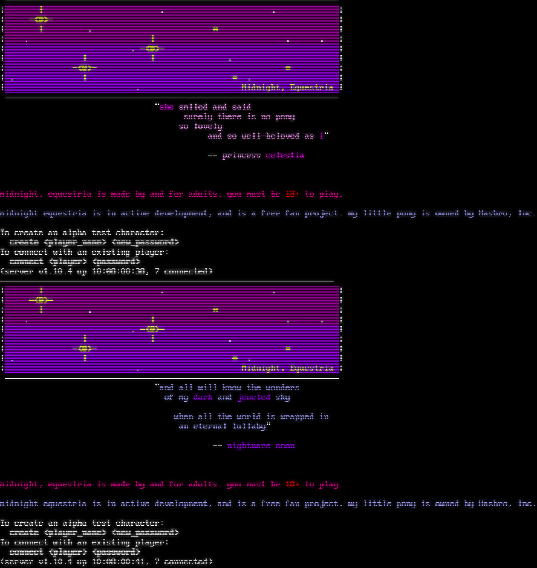 \| \| . . \| \| -<@>- \| \| \| . \* \| \| . \| . . \| \| . -<@>- \| \| \| \| . \| \| -<@>- \* \| \| . \| \* . \| \| . Midnight, Equestria \| "she smiled and said surely there is no pony so lovely and so well-beloved as I" -- princess celestia midnight, equestria is made by and for adults. you must be 18+ to play. midnight equestria is in active development, and is a free fan project. my little pony is owned by Hasbro, Inc. To create an alpha test character: create <player_name> <new_password> To connect with an existing player: connect <player> <password> (server v1.10.4 up 10:08:00:38, 7 connected) \| \| . . \| \| -<@>- \| \| \| . \* \| \| . \| . . \| \| . -<@>- \| \| \| \| . \| \| -<@>- \* \| \| . \| \* . \| \| . Midnight, Equestria \| "and all will know the wonders of my dark and jeweled sky when all the world is wrapped in an eternal lullaby" -- nightmare moon midnight, equestria is made by and for adults. you must be 18+ to play. midnight equestria is in active development, and is a free fan project. my little pony is owned by Hasbro, Inc. To create an alpha test character: create <player_name> <new_password> To connect with an existing player: connect <player> <password> (server v1.10.4 up 10:08:00:41, 7 connected)