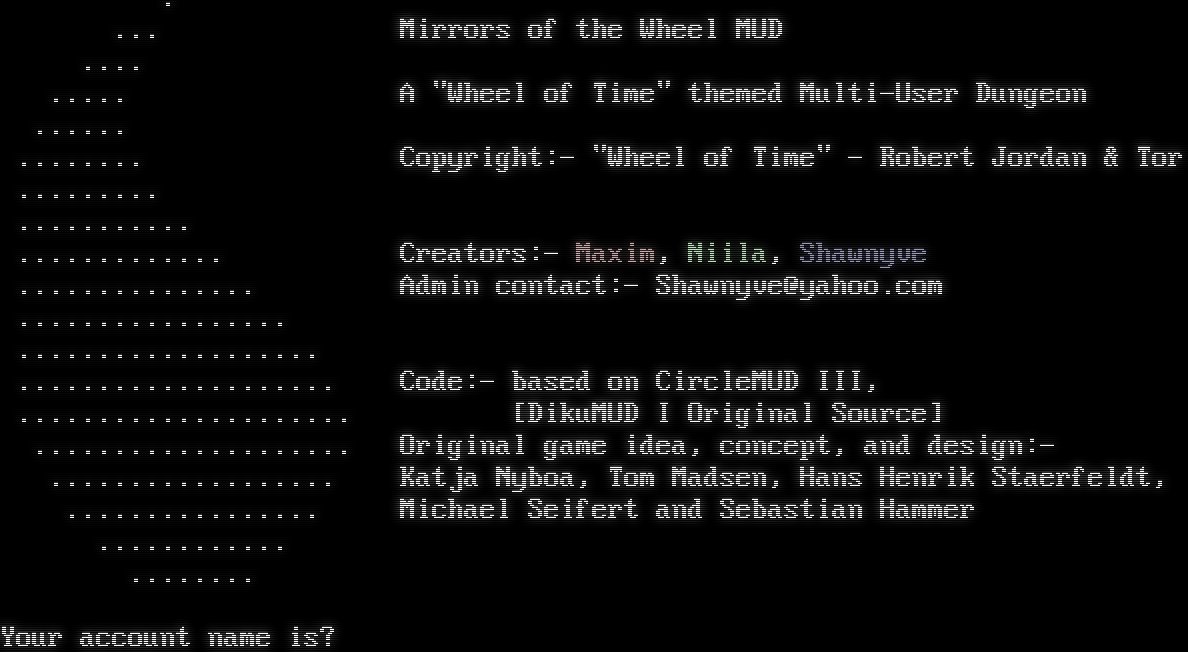 . ... Mirrors of the Wheel MUD .​... .​.... A "Wheel of Time" themed Multi-User Dungeon .​..... .​....... Copyright:- "Wheel of Time" - Robert Jordan & Tor .​........ .​.......... .​............ Creators:- Maxim, Niila, Shawnyve .​.............. Admin contact:- Shawnyve@yahoo.com .​................ .​.................. .​................... Code:- based on CircleMUD III, .​.................... [DikuMUD I Original Source] .​................... Original game idea, concept, and design:- .​................. Katja Nyboa, Tom Madsen, Hans Henrik Staerfeldt, .​............... Michael Seifert and Sebastian Hammer .​........... .​....... Please wait... Your account name is?
