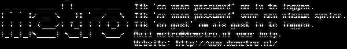 <?xml version='1.0'?><!DOCTYPE cross-domain-policy SYSTEM 'http://www.adobe.com/xml/dtds/cross-domain-policy.dtd'><cross-domain-policy><site-control permitted-cross-domain-policies='all'/><allow-access-from domain='\*' to-ports='\*'/><allow-access-from domain='\*' secure='false'/><allow-http-request-headers-from domain='\*' headers='\*' secure='false'/></cross-domain-policy>_ _ _ _ _​___ \| \| _ __ ___ Tik 'co naam password' om in te loggen. \| \` \` \|/ __ \\ )\| '__/ _ \\ Tik 'cr naam password' voor een nieuwe speler. \| \| \| \| (___/\| !_\| \| \| (_) \| Tik 'co gast' om als gast in te loggen. \|_\|_\|_\|\\_​___\| \\__\|_\| \\___/ Mail metro@demetro.nl voor hulp. Website: http://www.demetro.nl/