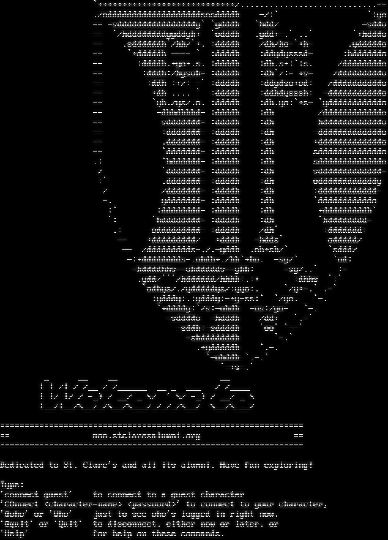 \`+​+++++++++++++++++++++++++++/.​...........................-- ./odddddddddddddddddddsosddddh -/:\` \`:yo -- -sddddddddddddddddy\` \`ydddh \`hdd/ -sddo -- \`/hddddddddyyddyh+ \`odddh .ydd+-.\` ..\` \`+hdddo -- .sddddddh\`/hh/\`+. :ddddh /dh/ho-\`+h- .ydddddo -- \`+dddddh -​--- \` :ddddh :ddydysssd- :hddddddo -- :ddddh.+yo+.s. :ddddh :dh.s+:\`:s. /ddddddddo -- :dddh:/hysoh- :ddddh :dh\`/:- +s- /dddddddddo -- :ddh :+/: -\` :ddddh :ddydso+od: /ddddddddddo -- +dh .​... \` :ddddh :ddhdysssh: -dddddddddddo -- \`yh./ys/.o. :ddddh :dh.yo:\`+s- \`ydddddddddddo -- -dhhdhhhd- :ddddh :dh /ddddddddddddo -- sddddddd- :ddddh :dh hddddddddddddo -- :ddddddd- :ddddh :dh -dddddddddddddo -- .ddddddd- :ddddh :dh +dddddddddddddo -- \`ddddddd- :ddddh :dh sdddddddddddddo .: \`hdddddd- :ddddh :dh sdddddddddddddo / \`ddddddd- :ddddh :dh sddddddddddddd- :\` .ddddddd- :ddddh :dh oddddddddddddy / /ddddddd- :ddddh :dh :dddddddddddd- -. yddddddd- :ddddh :dh \`dddddddddddo :\` :dddddddd- :ddddh :dh +dddddddddh\` \`: \`hdddddddd- :ddddh :dh \`hdddddddd- .: oddddddddd- :ddddh /dh\` :ddddddd: -- +ddddddddd/ +dddh -hdds\` oddddd/ -- /ddddddddds-./.-yddh .oh+sh/\` \`sddd/ -:+dddddddds-.ohdh+./hh\`+ho. -sy/\` \`od: -hddddhhs--ohddddds--yhh: -sy/..\` :- .ydd/\`\`\`/hdddddd/hhhh:.:+ :dhhs \`:\` \`odhys/./ydddddys/:yyo:. \`/y+-.\` .-\` :ydddy:.:ydddy:-+y-ss:\` \`/yo. \`-. \`+ddddy:\`/s:-ohdh -os:/yo- \`-. -sddddo -hdddh /dd+ \`.-\` -sddh:-sddddh \`oo\` \`--\` -shdddddddh \`-.\` .+ydddddh \`.-. \`-ohddh \`.-.\` \`-+s-.\` _ __ __ __ \| \| /\| / /__ / /_​_____ __ _ ___ / /_​___ \| \|/ \|/ / -_) / __/ _ \\/ ' \\/ -_) / __/ _ \\ \|__/\|__/\\__/_/\\__/\\___/_/_/_/\\__/ \\__/\\___/ =​============================================================= == moo.stclaresalumni.org == =​============================================================= Dedicated to St. Clare's and all its alumni. Have fun exploring! Type: 'connect guest' to connect to a guest character 'COnnect <character-name> <password>' to connect to your character, '@who' or 'Who' just to see who's logged in right now, '@quit' or 'Quit' to disconnect, either now or later, or 'Help' for help on these commands.