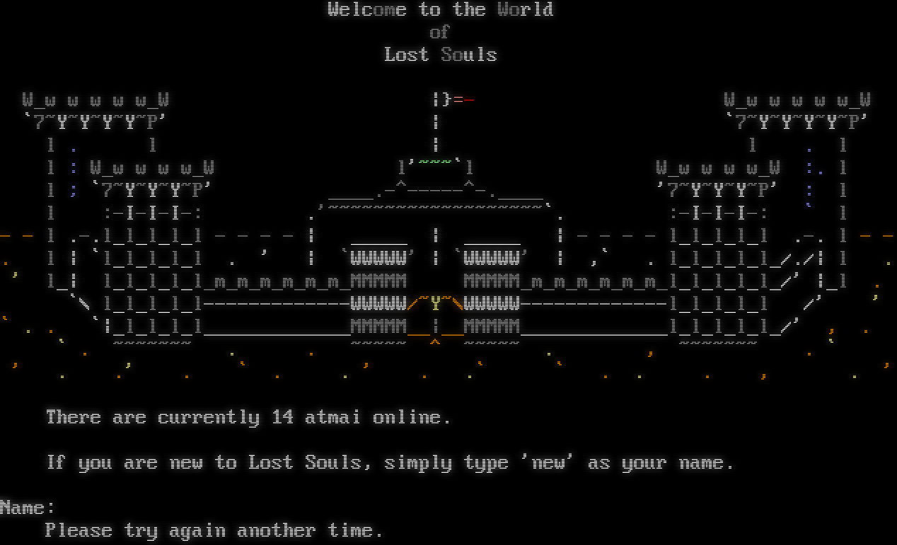 Welcome to the World of Lost Souls W_w w w w w_W \|}=- W_w w w w w_W \`7~Y~Y~Y~Y~P' \| \`7~Y~Y~Y~Y~P' l . l \| l . l l : W_w w w w_W l'~~~\`l W_w w w w_W :. l l ; \`7~Y~Y~Y~P' _​___.-^-----^-.____ '7~Y~Y~Y~P' : l l :-I-I-I-: .'~​~~~~~~~~~~~~~~~~~~\`. :-I-I-I-: \` l - - l .-.l_l_l_l_l - - - - \| _​____ \| _​____ \| - - - - l_l_l_l_l .-. l - - . l \| \`l_l_l_l_l . ' \| \`WWWWW' \| \`WWWWW' \| ,\` . l_l_l_l_l_/./\| l . ' l_\| l_l_l_l_l_m_m_m_m_m_m_MMMMM MMMMM_m_m_m_m_m_m_l_l_l_l_l_/' \|_l . \`\\ l_l_l_l_l-​------------WWWWW/~Y~\\WWWWW-​------------l_l_l_l_l /' ' \` . . \`\|_l_l_l_l_​____________MMMMM__\|__MMMMM_​____________l_l_l_l_l_/' , . \` . ~​~~~~~~ . . ~​~~~~ ^ ~​~~~~ . , ~​~~~~~~ . \` ' . .' . \` . . ' . .\` \` . . . , . ' There are currently 14 atmai online. If you are new to Lost Souls, simply type 'new' as your name. Name: Please try again another time.
