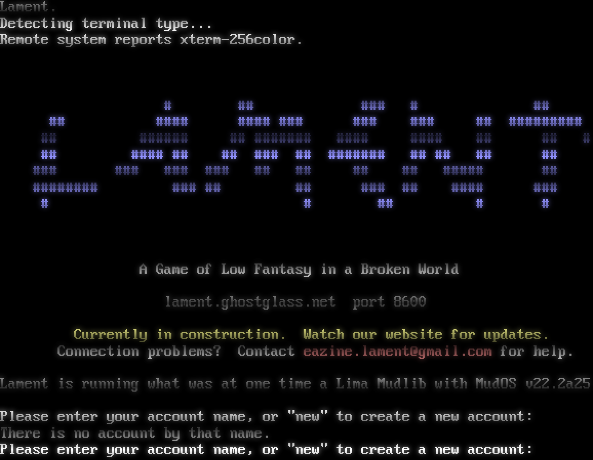 Lament. Detecting terminal type... Remote system reports xterm-256color. # ## ### # ## ## #​### #​### ### ### ### ## #​######## ## #​##### ## #​###### #​### #​### ## ## # ## #​### ## ## ### ## #​###### ## ## ## ## ### ### ### ### ## ## ## ## #​#### ## #​####### ### ## ## ### ## #​### ### # # ## # # A Game of Low Fantasy in a Broken World lament.ghostglass.net port 8600 Currently in construction. Watch our website for updates. Connection problems? Contact eazine.lament@gmail.com for help. Lament is running what was at one time a Lima Mudlib with MudOS v22.2a25 Please enter your account name, or "new" to create a new account: There is no account by that name. Please enter your account name, or "new" to create a new account: