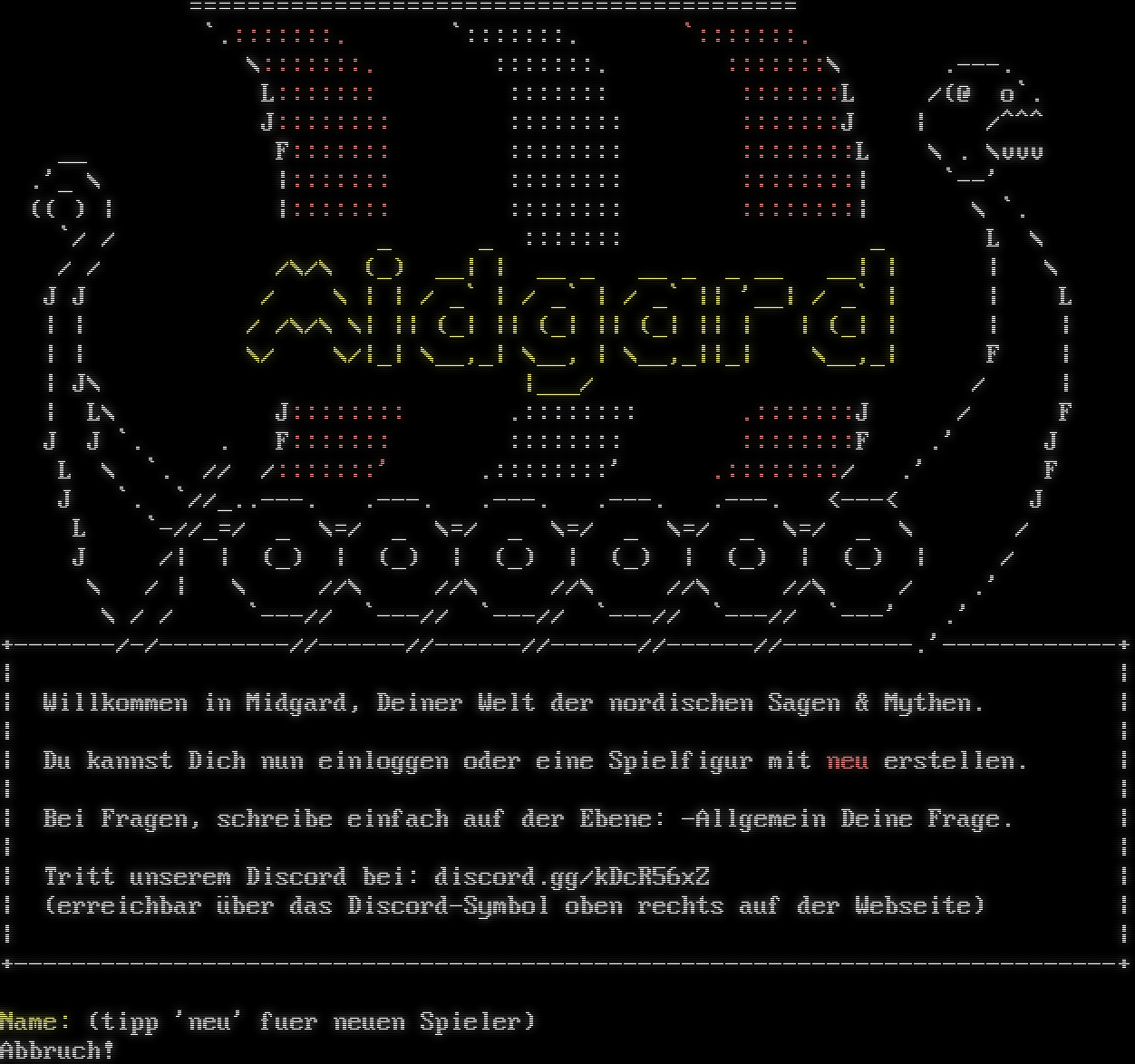 =​========================================= \`.:::::::. \`:::::::. \`:::::::. \\:::::::. :::::::. :::::::\\ .​---. L::::::: ::::::: :::::::L /(@ o\`. J:::::::: :::::::: :::::::J \| /^^^ __ F::::::: :::::::: ::::::::L \\ . \\vvv .'_ \\ \|::::::: :::::::: ::::::::\| \`--' (( ) \| \|::::::: :::::::: ::::::::\| \\ \`. \`/ / _ _ ::::::: _ L \\ / / /\\/\\ (_) __\| \| __ _ __ _ _ __ __\| \| \| \\ J J / \\ \| \| / _\` \| / _\` \| / _\` \|\| '__\| / _\` \| \| L \| \| / /\\/\\ \\\| \|\| (_\| \|\| (_\| \|\| (_\| \|\| \| \| (_\| \| \| \| \| \| \\/ \\/\|_\| \\__,_\| \\__, \| \\__,_\|\|_\| \\__,_\| F \| \| J\\ \|___/ / \| \| L\\ J:::::::: .:::::::: .:::::::J / F J J \`. . F::::::: :::::::: ::::::::F .' J L \\ \`. // /:::::::' .::::::::' .::::::::/ .' F J \`. \`//_​..---. .​---. .​---. .​---. .​---. <---< J L \`-//_=/ _ \\=/ _ \\=/ _ \\=/ _ \\=/ _ \\=/ _ \\ / J /\| \| (_) \| (_) \| (_) \| (_) \| (_) \| (_) \| / \\ / \| \\ //\\ //\\ //\\ //\\ //\\ / .' \\ / / \`---// \`---// \`---// \`---// \`---// \`---' .' +​-------/-/-​--------//-​-----//-​-----//-​-----//-​-----//-​--------.'-​-----------+ \| \| \| Willkommen in Midgard, Deiner Welt der nordischen Sagen & Mythen. \| \| \| \| Du kannst Dich nun einloggen oder eine Spielfigur mit neu erstellen. \| \| \| \| Bei Fragen, schreibe einfach auf der Ebene: -Allgemein Deine Frage. \| \| \| \| Tritt unserem Discord bei: discord.gg/kDcR56xZ \| \| (erreichbar über das Discord-Symbol oben rechts auf der Webseite) \| \| \| +​----------------------------------------------------------------------------+ Name: (tipp 'neu' fuer neuen Spieler) Abbruch!