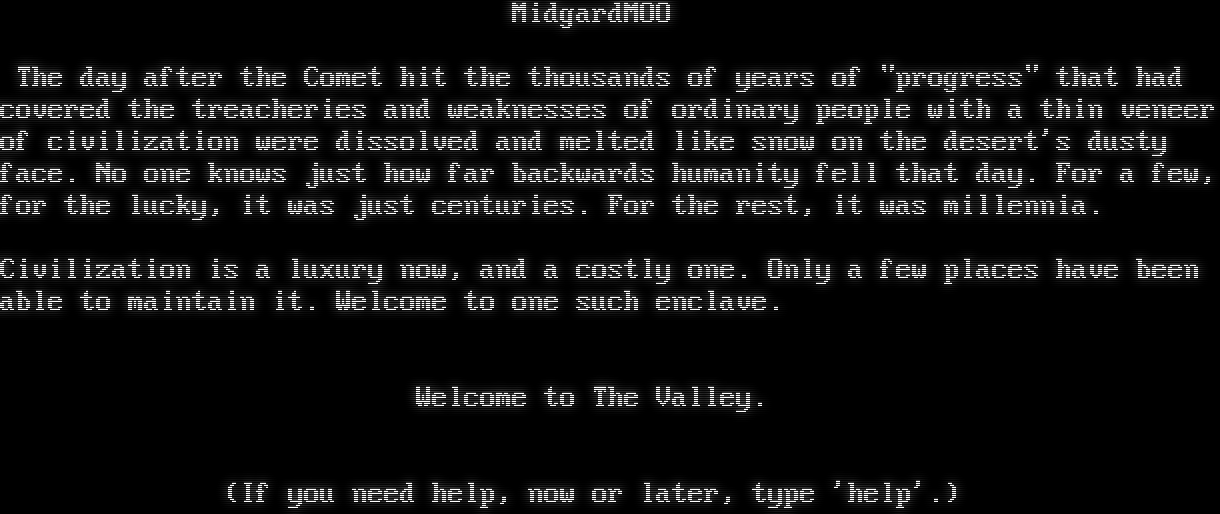 MidgardMOO The day after the Comet hit the thousands of years of "progress" that had covered the treacheries and weaknesses of ordinary people with a thin veneer of civilization were dissolved and melted like snow on the desert's dusty face. No one knows just how far backwards humanity fell that day. For a few, for the lucky, it was just centuries. For the rest, it was millennia. Civilization is a luxury now, and a costly one. Only a few places have been able to maintain it. Welcome to one such enclave. Welcome to The Valley. (If you need help, now or later, type 'help'.)