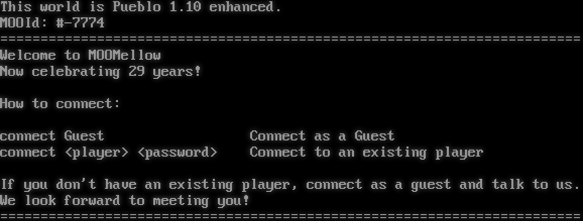 This world is Pueblo 1.10 enhanced. MOOId: #-7774 =​======================================================================= Welcome to MOOMellow Now celebrating 29 years! How to connect: connect Guest Connect as a Guest connect <player> <password> Connect to an existing player If you don't have an existing player, connect as a guest and talk to us. We look forward to meeting you! =​=======================================================================