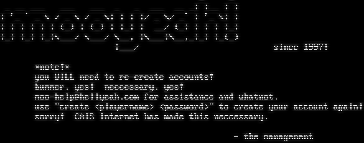 _ _ _ __ ___ ___ ___ _ _ ___ __ _\| \|__ \| \| \| '_ \` _ \\ / _ \\ / _ \\\| \| \| \|/ _ \\/ _\` \| '_ \\\| \| \| \| \| \| \| \| (_) \| (_) \| \|_\| \| __/ (_\| \| \| \| \|_\| \|_\| \|_\| \|_\|\\___/ \\___/ \\__, \|\\___\|\\__,_\|_\| \|_(_) \|___/ since 1997! \*note!\* you WILL need to re-create accounts! bummer, yes! neccessary, yes! moo-help@hellyeah.com for assistance and whatnot. use "create <playername> <password>" to create your account again! sorry! CAIS Internet has made this neccessary. - the management