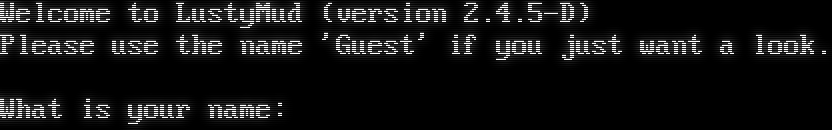 Welcome to LustyMud (version 2.4.5-D) Please use the name 'Guest' if you just want a look. What is your name: