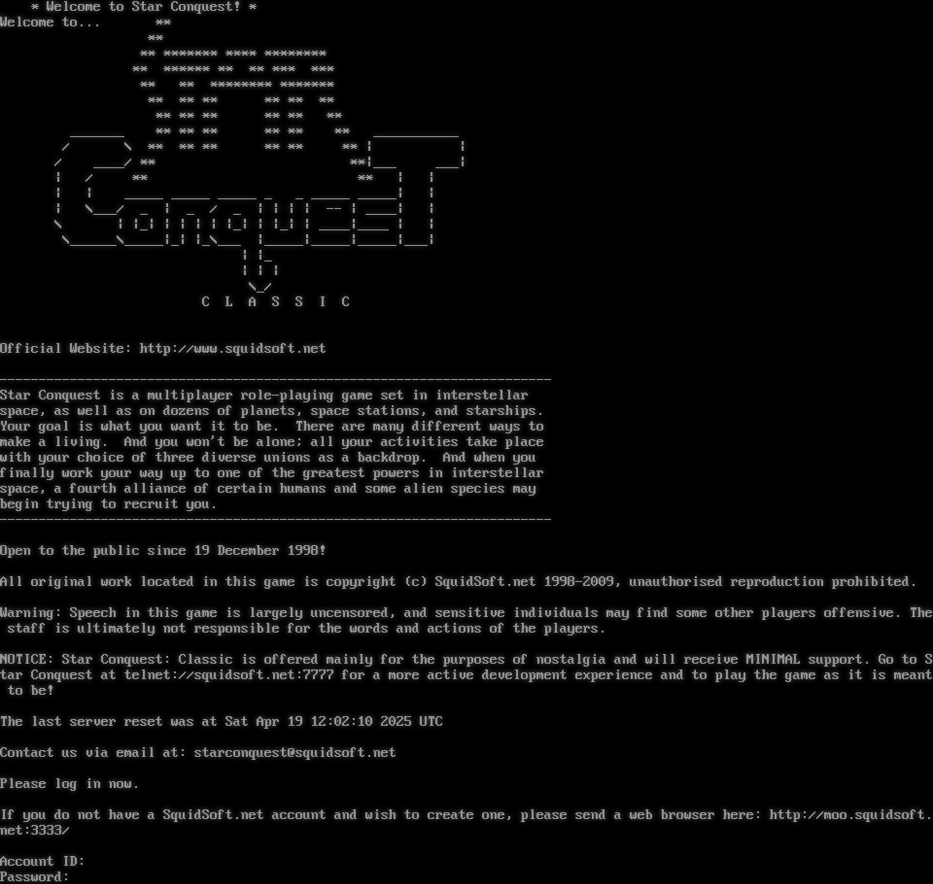 \* Welcome to Star Conquest! \* Welcome to... \*\* \*\* \*\* \*\*\*\*\*\*\* \*\*\*\* \*\*\*\*\*\*\*\* \*\* \*\*\*\*\*\* \*\* \*\* \*\*\* \*\*\* \*\* \*\* \*\*\*\*\*\*\*\* \*\*\*\*\*\*\* \*\* \*\* \*\* \*\* \*\* \*\* \*\* \*\* \*\* \*\* \*\* \*\* _​______ \*\* \*\* \*\* \*\* \*\* \*\* _​__________ / \\ \*\* \*\* \*\* \*\* \*\* \*\* \| \| / _​___/ \*\* \*\*\|___ ___\| \| / \*\* \*\* \| \| \| \| _​____ _​____ _​____ _ _ _​____ _​____\| \| \| \\___/ _ \| _ / _ \| \| \| \| -- \| _​___\| \| \\ \| \|_\| \| \| \| \| \|_\| \| \|_\| \| _​___\|_​___ \| \| \\_​_____\\_​____\|_\| \|_\\___ \|_​____\|_​____\|_​____\|___\| \| \|_ \| \| \| \\_/ C L A S S I C Official Website: http://www.squidsoft.net -​---------------------------------------------------------------------- Star Conquest is a multiplayer role-playing game set in interstellar space, as well as on dozens of planets, space stations, and starships. Your goal is what you want it to be. There are many different ways to make a living. And you won't be alone; all your activities take place with your choice of three diverse unions as a backdrop. And when you finally work your way up to one of the greatest powers in interstellar space, a fourth alliance of certain humans and some alien species may begin trying to recruit you. -​---------------------------------------------------------------------- Open to the public since 19 December 1998! All original work located in this game is copyright (c) SquidSoft.net 1998-2009, unauthorised reproduction prohibited. Warning: Speech in this game is largely uncensored, and sensitive individuals may find some other players offensive. The staff is ultimately not responsible for the words and actions of the players. NOTICE: Star Conquest: Classic is offered mainly for the purposes of nostalgia and will receive MINIMAL support. Go to Star Conquest at telnet://squidsoft.net:7777 for a more active development experience and to play the game as it is meant to be! The last server reset was at Sat Apr 19 12:02:10 2025 UTC Contact us via email at: starconquest@squidsoft.net Please log in now. If you do not have a SquidSoft.net account and wish to create one, please send a web browser here: http://moo.squidsoft.net:3333/ Account ID: Password: