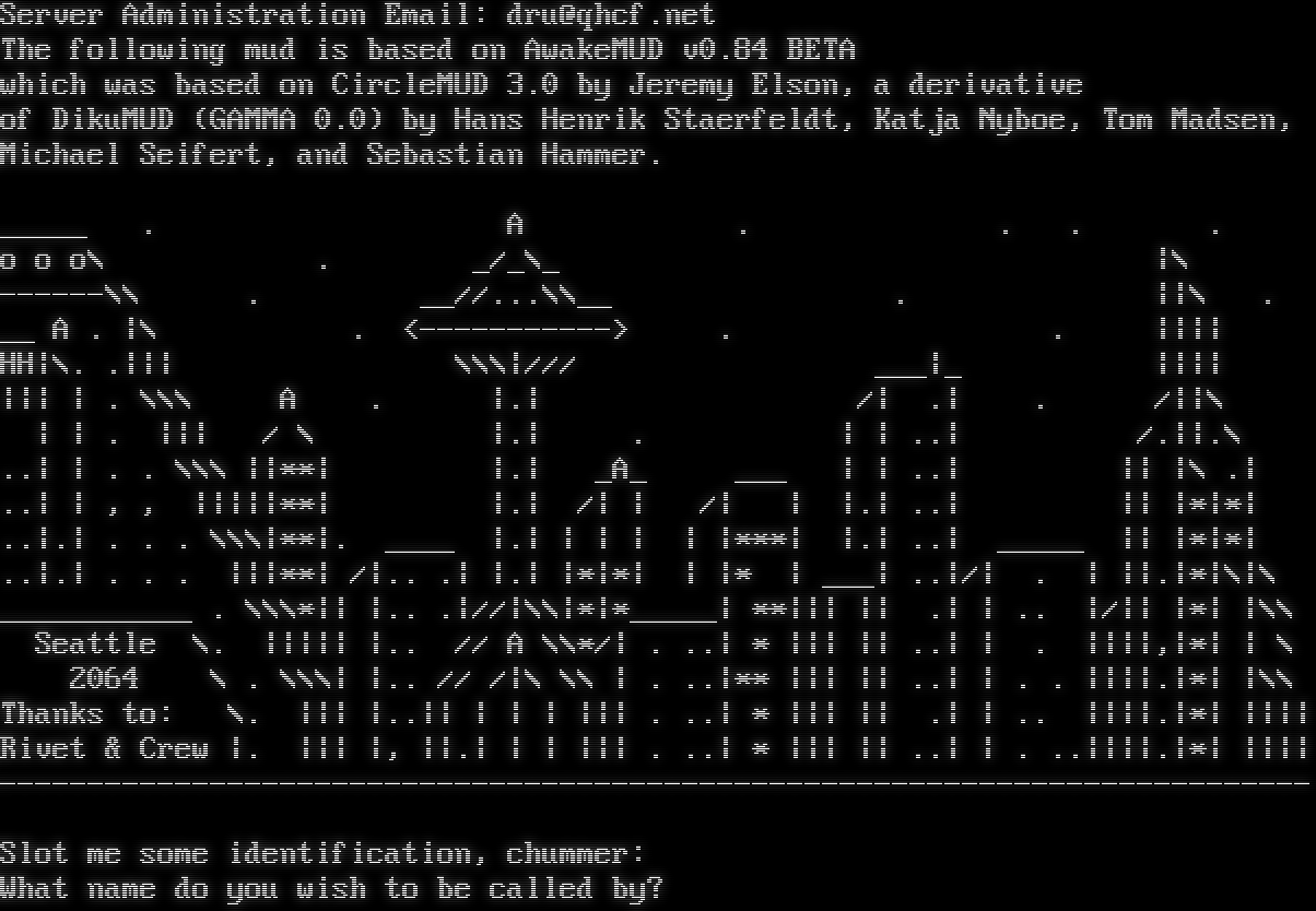 Server Administration Email: dru@qhcf.net The following mud is based on AwakeMUD v0.84 BETA which was based on CircleMUD 3.0 by Jeremy Elson, a derivative of DikuMUD (GAMMA 0.0) by Hans Henrik Staerfeldt, Katja Nyboe, Tom Madsen, Michael Seifert, and Sebastian Hammer. _​____ . A . . . . o o o\\ . _/_\\_ \|\\ -​-----\\\\ . __//...\\\\__ . \|\|\\ . __ A . \|\\ . <-​----------> . . \|\|\|\| HH\|\\. .\|\|\| \\\\\\\|/// ___\|_ \|\|\|\| \|\|\| \| . \\\\\\ A . \|.\| /\| .\| . /\|\|\\ \| \| . \|\|\| / \\ \|.\| . \| \| ..\| /.\|\|.\\ ..\| \| . . \\\\\\ \|\|\*\*\| \|.\| _A_ ___ \| \| ..\| \|\| \|\\ .\| ..\| \| , , \|\|\|\|\|\*\*\| \|.\| /\| \| /\| \| \|.\| ..\| \|\| \|\*\|\*\| ..\|.\| . . . \\\\\\\|\*\*\|. _​___ \|.\| \| \| \| \| \|\*\*\*\| \|.\| ..\| _​____ \|\| \|\*\|\*\| ..\|.\| . . . \|\|\|\*\*\| /\|.. .\| \|.\| \|\*\|\*\| \| \|\* \| ___\| ..\|/\| . \| \|\|.\|\*\|\\\|\\ _​__________ . \\\\\\\*\|\| \|.. .\|//\|\\\\\|\*\|\*_​____\| \*\*\|\|\| \|\| .\| \| .. \|/\|\| \|\*\| \|\\\\ Seattle \\. \|\|\|\|\| \|.. // A \\\\\*/\| . ..\| \* \|\|\| \|\| ..\| \| . \|\|\|\|,\|\*\| \| \\ 2064 \\ . \\\\\\\| \|.. // /\|\\ \\\\ \| . ..\|\*\* \|\|\| \|\| ..\| \| . . \|\|\|\|.\|\*\| \|\\\\ Thanks to: \\. \|\|\| \|..\|\| \| \| \| \|\|\| . ..\| \* \|\|\| \|\| .\| \| .. \|\|\|\|.\|\*\| \|\|\|\| Rivet & Crew \|. \|\|\| \|, \|\|.\| \| \| \|\|\| . ..\| \* \|\|\| \|\| ..\| \| . ..\|\|\|\|.\|\*\| \|\|\|\| -​-------------------------------------------------------------------------- Slot me some identification, chummer: What name do you wish to be called by?