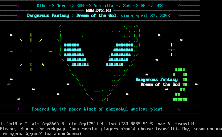 -​-------------------------------------------------------------------------------- -​------> Diku -> Merc -> ROM -> Anatolia -> SoG -> DF -> DF2 <-​------- -​--------------------------------- WWW.DF2.RU -​---------------------------------- -​------> Dangerous Fantasy : Dream of the God, since april 27, 2002 <-​------- -​-------------------------------------------------------------------------------- ./. . ..\\ \|. . . ^. ..\| \* \| \|\| . . . !.\| \* \\ \| / \\( . ,)/ \* \|. #​##### .​#######,,\| \| _ . _ \|.​####### .​.########,\| -+- \\ #​####### ,#​####### ,/ \| \\ #​####### . #​#######.,/ \* / \| \\ \\ #​###### #​######..,/ \| \\ . . ..,/ #​### \\. \| \| . .,/ \* # ## \* \\ ..,/ Dangerous Fantasy ## \* \* \\. .,/ Dream of the God ## \* \* \\ _​__. ,/ \* ## \* \\ ,/ \* ## \* \|\\ .,/\| #​##### -​-------------------------------------------------------------------------------- -​------> Powered by 4th power block of chernobyl nuclear plant. <-​------- -​-------------------------------------------------------------------------------- 1. koi8-r 2. alt (cp866) 3. win (cp1251) 4. iso (ISO-8859-5) 5. mac 6. translit Please, choose the codepage (non-russian players should choose translit): Под каким именем ты здесь будешь? (на английском)