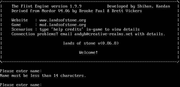 /-​--------------------------------------------------------------------------\\ \| The Flint Engine version 1.9.9 Developed by Shihan, Kaedan \| \| Derived from Mordor V4.06 by Brooke Paul & Brett Vickers \| \| \| \| Website : www.landsofstone.org \| \| Game : mud.landsofstone.org \| \| Scenarios : type 'help credits' in-game to view details \| \| Connection problems? email andyb@creative-realms.net with details. \| \| \| \| lands of stone v(0.86.8) \| \| \| \| Welcome! \| \| \| \\-​--------------------------------------------------------------------------/ Please enter name: Name must be less than 14 characters. Please enter name: