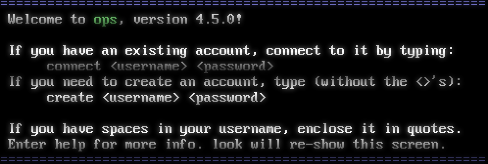 =​============================================================= Welcome to ops, version 4.5.0! If you have an existing account, connect to it by typing: connect &lt;username&gt; &lt;password&gt; If you need to create an account, type (without the &lt;&gt;'s): create &lt;username&gt; &lt;password&gt; If you have spaces in your username, enclose it in quotes. Enter help for more info. look will re-show this screen. =​=============================================================
