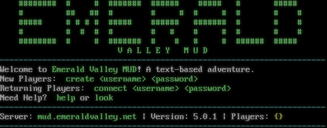 #​####### # # #​###### #​##### #​#### # #​#### # ## ## # # # # # # # # #​#### # # # # #​#### #​##### #​###### # # # # # # # # # # # # # # # #​####### # # #​###### # # # # #​##### #​#### V A L L E Y M U D -​-------------------------------------------------------------------- Welcome to Emerald Valley MUD! A text-based adventure. New Players: create &lt;username&gt; &lt;password&gt; Returning Players: connect &lt;username&gt; &lt;password&gt; Need Help? help or look -​-------------------------------------------------------------------- Server: mud.emeraldvalley.net \| Version: 5.0.1 \| Players: {} -​--------------------------------------------------------------------