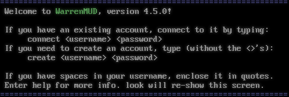=​============================================================= Welcome to WarrenMUD, version 4.5.0! If you have an existing account, connect to it by typing: connect &lt;username&gt; &lt;password&gt; If you need to create an account, type (without the &lt;&gt;'s): create &lt;username&gt; &lt;password&gt; If you have spaces in your username, enclose it in quotes. Enter help for more info. look will re-show this screen. =​=============================================================
