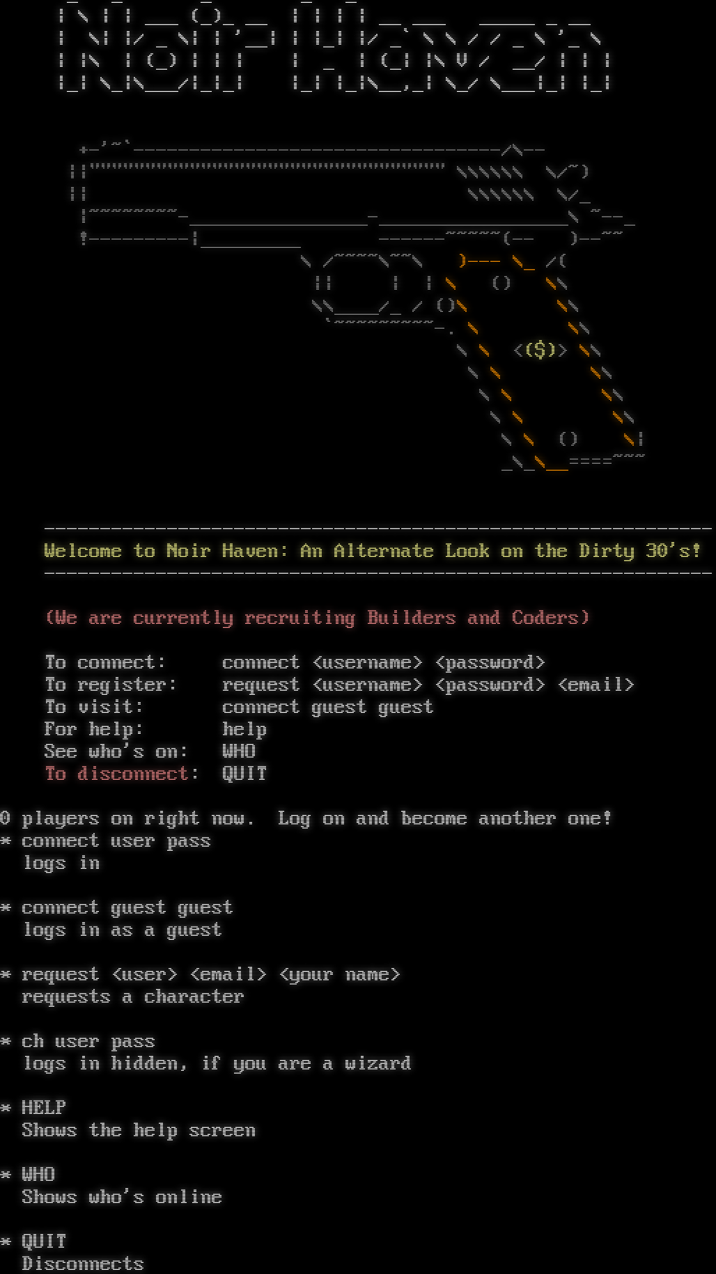 _ _ _ _ _ \| \\ \| \| ___ (_)_ __ \| \| \| \| __ ___ _​____ _ __ \| \\\| \|/ _ \\\| \| '__\| \| \|_\| \|/ _\` \\ \\ / / _ \\ '_ \\ \| \|\\ \| (_) \| \| \| \| _ \| (_\| \|\\ V / __/ \| \| \| \|_\| \\_\|\\___/\|_\|_\| \|_\| \|_\|\\__,_\| \\_/ \\___\|_\| \|_\| +-'~\`-​--------------------------------/\\-- \|\|"​""""""""""""""""""""""""""""""" \\\\\\\\\\\\ \\/~) \|\| \\\\\\\\\\\\ \\/_ \|~​~~~~~~~-________________-_________________\\ ~​--_ !-​--------\|_​________ -​-----~~~~~(-- )-​-~~ \\ /~​~~~\\~~\\ )--- \\_ /( \|\| \| \| \\ () \\\\ \\\\_​___/_ / ()\\ \\\\ \`~​~~~~~~~~-. \\ \\\\ \\ \\ <($)> \\\\ \\ \\ \\\\ \\ \\ \\\\ \\ \\ \\\\ \\ \\ () \\\| _\\_\\_​_====~~~ -​----------------------------------------------------------- Welcome to Noir Haven: An Alternate Look on the Dirty 30's! -​----------------------------------------------------------- (We are currently recruiting Builders and Coders) To connect: connect <username> <password> To register: request <username> <password> <email> To visit: connect guest guest For help: help See who's on: WHO To disconnect: QUIT 0 players on right now. Log on and become another one! \* connect user pass logs in \* connect guest guest logs in as a guest \* request <user> <email> <your name> requests a character \* ch user pass logs in hidden, if you are a wizard \* HELP Shows the help screen \* WHO Shows who's online \* QUIT Disconnects