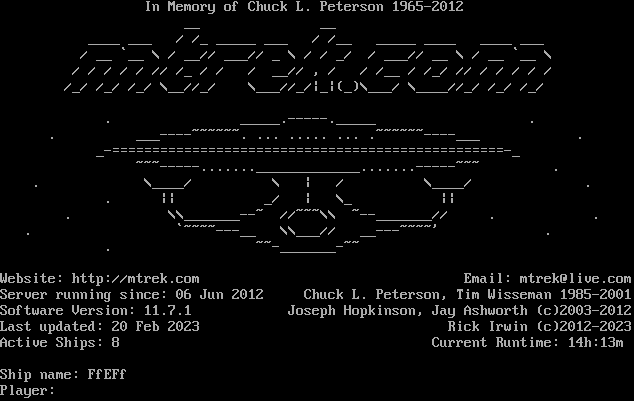 In Memory of Chuck L. Peterson 1965-2012 __ __ _​___ ___ / /_ _​____ ___ / /__ _​____ _​___ _​___ ___ / __ \`__ \\ / __// ___// _ \\ / / _/ / ___// __ \\ / __ \`__ \\ / / / / / // /_ / / / __// , / / /__ / /_/ // / / / / / /_/ /_/ /_/ \\__//_/ \\___//_/\|_\|(_)\\___/ \\_​___//_/ /_/ /_/ . _​____.-----._____ . . _​__----~~~~~~. ... .​.... ... .​~~~~~~----___ . _​-=================================================-_ ~​~~-----......._____________.......-----~~~ . . \\_​___/ \\ \| / \\_​___/ . . \|\| _/ \| \\_ \|\| . \\\\_​______--~ //~~~\\\\ ~​--_______// . . . \`~​~~~---__ \\\\___// _​_---~~~~' . . ~​~-_______-~~ Website: http://mtrek.com Email: mtrek@live.com Server running since: 06 Jun 2012 Chuck L. Peterson, Tim Wisseman 1985-2001 Software Version: 11.7.1 Joseph Hopkinson, Jay Ashworth (c)2003-2012 Last updated: 20 Feb 2023 Rick Irwin (c)2012-2023 Active Ships: 8 Current Runtime: 14h:13m Ship name: FfEFf Player: