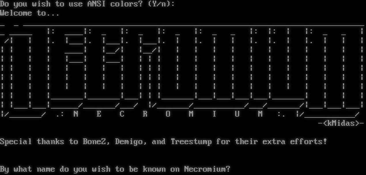 Do you wish to use ANSI colors? (Y/n): Welcome to... _ _ _​_________________________________________________________________________ _ _​____ \|: _​___\|: _ \|: _ \|: _ \|: _ _ \|: \|: \| \|: _ _ \| /\| \| \|. \|___\|. \|___\|. \|___\|. \| \|. \| \| \|. \|. \| \|. \| \| \| \| \| \| \| _​___\| \|__/\| \|__/\| \| \| \| \| \| \| \| \| \| \| \| \| \| \| \| \|___\| \|___\| \| \| \| \| \| \| \| \| \| \| \| \| \| \| \| \| \| \| \| \| \| \| \| \| \| \| \| \| \| \| \| \| \| \| \| \| \| \| \| \| \| \| \| \| \| \| \| \| \| \| \| \| \| \| \| \| \| \| \| \| \| \| \| \| \| \| \| \| \| \| \| \| \| \| \| \| \| \| \| \| \| \| \| \|_​______\|_​______\|___\| \| \|_​______\|___\|___\|___\|___\|_​______\| \| \| \| \| \|___\|___\|_​_____/_​______/___/ \|/_​______/_​__________/___/_​______/\|___\|___\|___\| \|/_​______/ .: N E C R O M I U M :. \|/_​__________/ -<kMidas>- Special thanks to BoneZ, Demigo, and Treestump for their extra efforts! By what name do you wish to be known on Necromium?