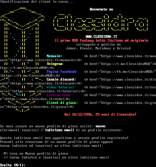 Identificazione del client in corso... _​.-"""-._ Benvenuto su _​.-"" "​"-._ ___ _ _ _ :"-. .-": / ___\|\| \| ___ ___ ___ (_) __\| \| _ __ __ _ '"​-_"-._ _​.-".-"' \| \| \| \| / _ \\/ __\|/ __\|\| \| / _\` \|\| '__\| / _\` \| \|\|"​-._"-._.-"_.-"\| \| \|___ \| \|\| __/\\__ \\\\__ \\\| \|\| (_\| \|\| \| \| (_\| \| \|\|: "​-...-" : \|\| \\_​___\|\|_\| \\___\|\|___/\|___/\|_\| \\__,_\|\|_\| \\__,_\| \|\| . \|\| . \|\| \|\| . \|\| . \|\| WWW.CLESSIDRA.IT \|\| ';:;\|\|' \|\| Il primo MUD fantasy tutto italiano ed originale \|\| ':;\|\| \|\| sviluppato e gestito da \|\| )\|\| \|\| Joker, Klenir, Molideus e Drivird \|\| ':\|\| \|\| \|\| .' :\|\|. \|\| Manuale: <A href="https://www.clessidra.it/manuale">https://www.clessidra.it/manuale</A> \|\| ' ..:\|\|.' \|\| Telegram: <A href="https://t.me/ClessidraMUD">https://t.me/ClessidraMUD</A> \|\|.'-.:;:\|\|:-'._\|\| Pagina facebook: <A href="https://fb.me/ClessidraMUD/">https://fb.me/ClessidraMUD</A> .-'": .:;:;\|\|::.: "'-. Canale discord: <A href="https://www.clessidra.it/discord">https://www.clessidra.it/discord</A> :"-.'::::::\|\|:; ' .-": Video tutorial: <A href="https://www.clessidra.it/tutorial">https://www.clessidra.it/tutorial</A> "​-."-._"--\|\| .​-".-" Listino rune: <A href="https://www.clessidra.it/rune">https://www.clessidra.it/rune</A> "​-._"-._.-".-" Client di gioco: <A href="https://www.clessidra.it/gioca">https://www.clessidra.it/gioca</A> "-.\|.-" Dal 22/12/1996, 29 anni di Clessidra! Se vuoi creare un nuovo profilo di gioco scrivi: nuovo altrimenti inserisci l'indirizzo email di un profilo esistente: Questo indirizzo email non appartiene a nessun profilo registrato! Procedi alla creazione di un nuovo profilo di gioco oppure torna indietro ed inserisci un altro indirizzo email. N) crea un Nuovo profilo di gioco i) torna Indietro e inserisci un altro indirizzo email Scelta (N/i):