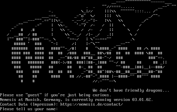 _​_----~~~~~~~~~~~------___ . . ~~//=​===...... _​_--~ ~~ -. \\_\|// \|\|\|\\\\ ~​~~~~~::::... /~ _​__-==_ _-~o~ \\/ \|\|\| \\\\ _/~~- _​_---~~~.==~\|\|\\=_ -​_--~/_-~\|- \|\\\\ \\\\ _/~ _​-~~ .=~ \| \\\\-_ '-~7 /- / \|\| \\ / .~ # .# \| \\\\ -_ / /- / \|\| \\ / / _​_## / ## \| \\\\ ~-_/ /\|- _/ .\|\| \\ / \|~~ #​##~~\|-​###~~--_ \\ ~​==-/ \| \\~​--===~~ .\\ #​#### ' ### ~-\| /\| \|-~\\~~ _​_--~~ #​###### #​### #​###~~-_/#\| # ~\\#​###_-~ #​### ## /\\ #​### #​### ### #​### ## ## /### #​##__ ##\\/## ## ## #​### \\## ## #​### ### #​### ## _​--~##/## #​#~##__##-~-/ ### #​##~==. #​### #​###### ###(->/## ###\|\|#​#-_\|### ~~-/ ## ## ## _\|\| ### #​#### ## ## #-_ ## ## ~​~-###__i##i__i-​-###/ ### ### ## ## ## _​-~##_ ##~)##\\-​##__##___##___##-~## ## ## #​### ## //.​-##~-~_#### \|-​-####-~~ #​#~~~ #​### # # //.​-~~~--\\ We don't have friendly dragons... Please use "guest" if you're just being curious. Nemesis at Munich, Germany, is currently running version 03.01.02. Contact Data (Impressum): https://nemesis.de/contact/ Please tell us your name:
