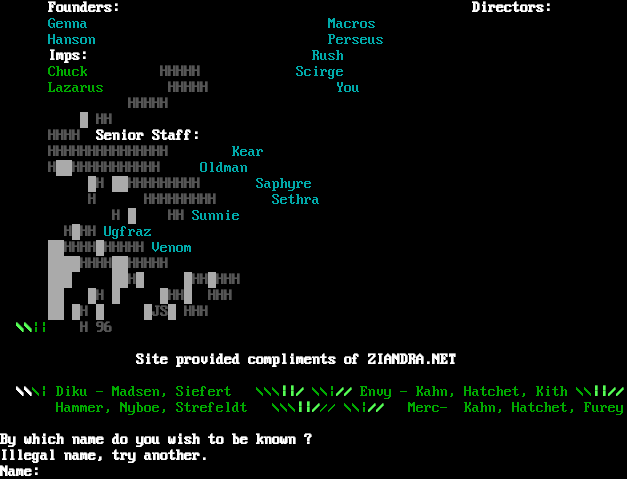 Founders: Directors: Genna Macros Hanson Perseus Imps: Rush ChuckHHHHH Scirge Lazarus HHHHH You HHHHH HH HHHH Senior Staff: HHHHHHHHHHHHHHHKear H HHHHHHHHHHH   Oldman H HHHHHHHHH Saphyre H HHHHHHHHH Sethra 444H 4444HHSunnie H HH Ugfraz       HHHH HHHHH Venom       HHHH HHHHH H HH HHH H HH HHH H JS HHH \\\\\|\| H 96 Site provided compliments of ZIANDRA.NET \\\\\\\| Diku - Madsen, Siefert \\\\\\\|\|/ \\\\\|// Envy - Kahn, Hatchet, Kith \\\\\|\|// Hammer, Nyboe, Strefeldt \\\\\\\|\|/// \\\\\|// Merc- Kahn, Hatchet, Furey By which name do you wish to be known ? Illegal name, try another. Name: