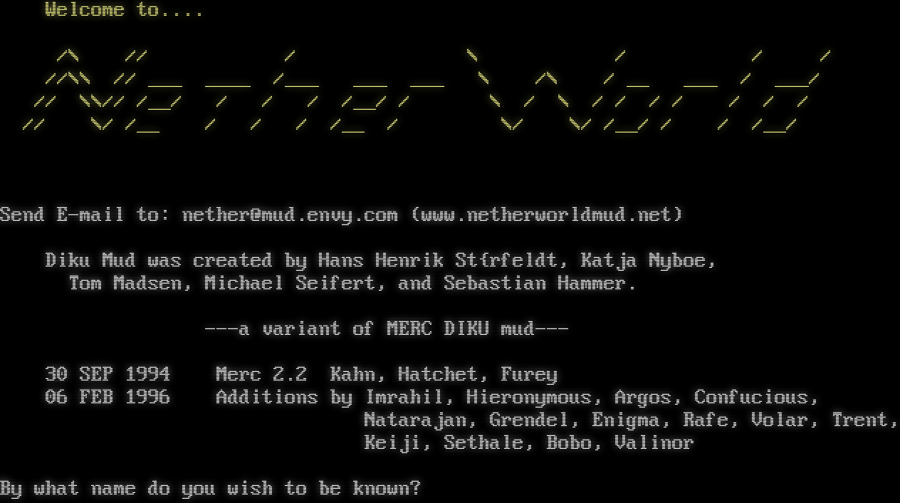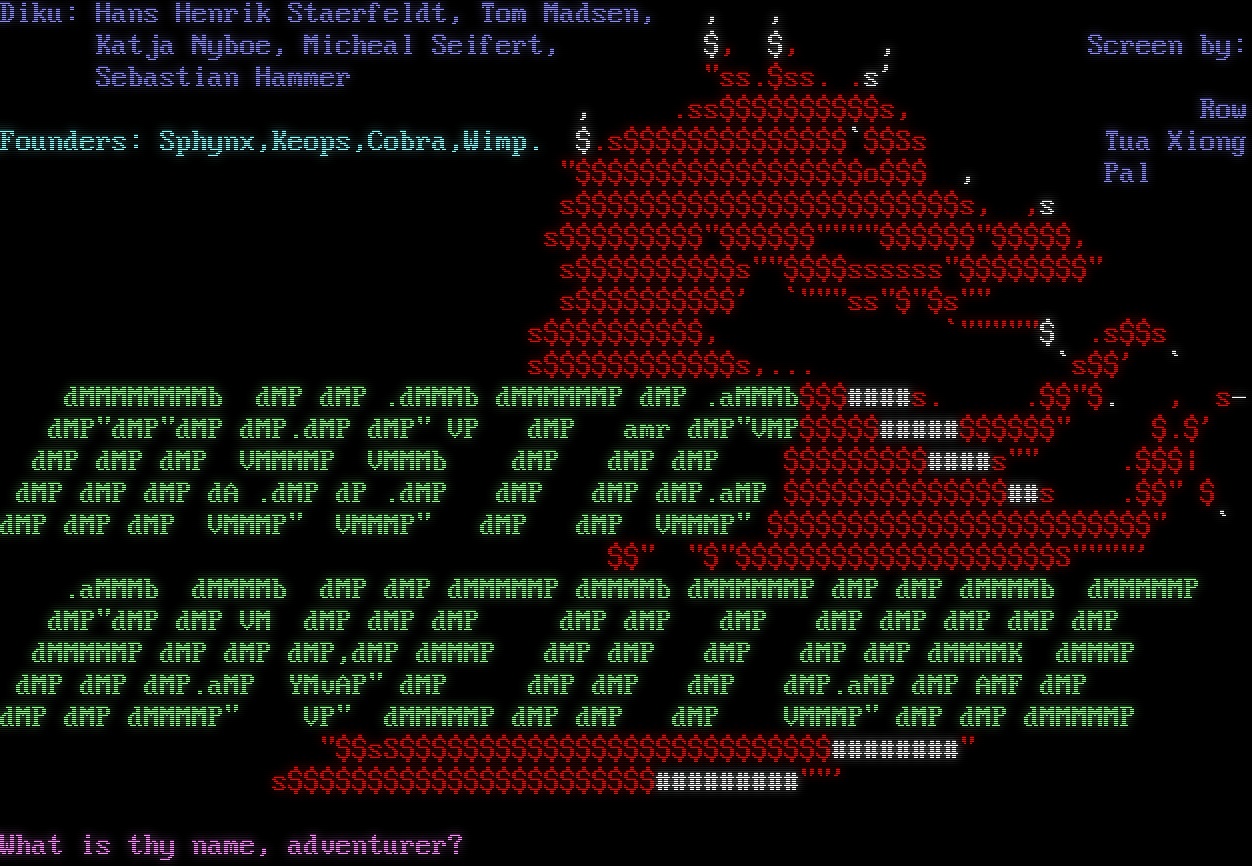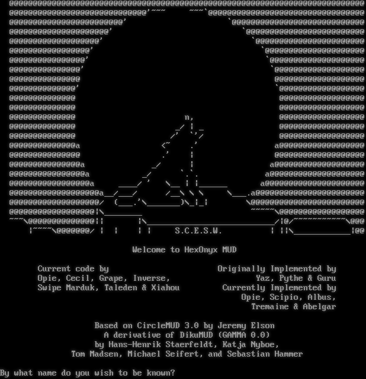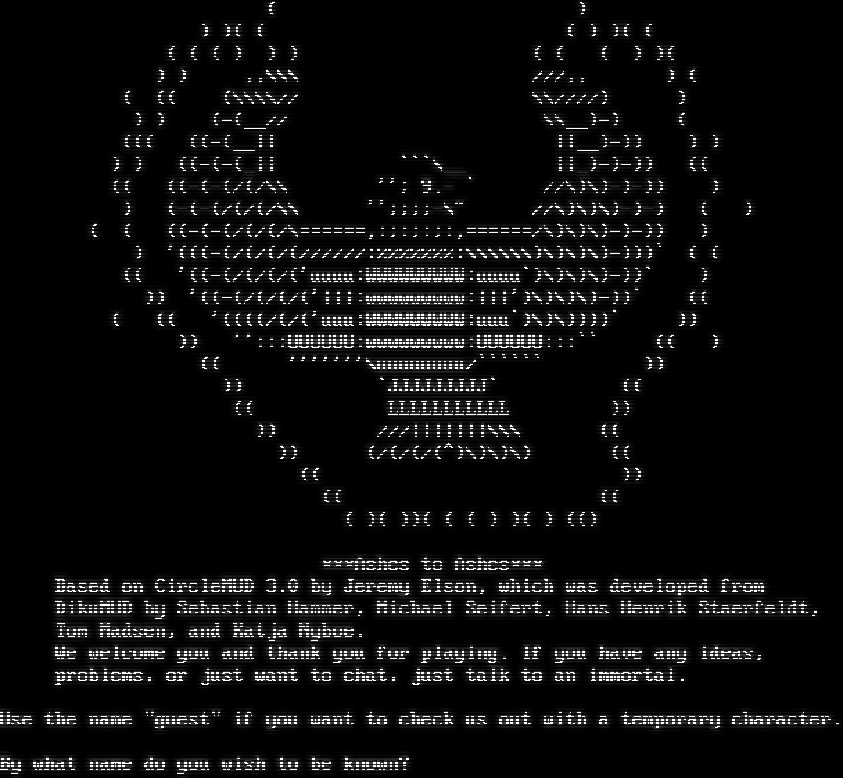 ( ) ) )( ( ( ) )( ( ( ( ( ) ) ) ( ( ( ) )( ) ) ,,\\\\\\ ///,, ) ( ( (( (\\\\\\\\// \\\\////) ) ) ) (-(__// \\\\__)-) ( ((( ((-(__\|\| \|\|__)-)) ) ) ) ) ((-(-(_\|\| \`\`\`\\__ \|\|_)-)-)) (( (( ((-(-(/(/\\\\ ''; 9.- \` //\\)\\)-)-)) ) ) (-(-(/(/(/\\\\ '';;;;-\\~ //\\)\\)\\)-)-) ( ) ( ( ((-(-(/(/(/\\=​=====,:;:;:;:,=​=====/\\)\\)\\)-)-)) ) ) '(((-(/(/(/(//////:%%%%%%%:\\\\\\\\\\\\)\\)\\)\\)-)))\` ( ( (( '((-(/(/(/('uuuu:WWWWWWWWW:uuuu\`)\\)\\)\\)-))\` ) )) '((-(/(/(/('\|\|\|:wwwwwwwww:\|\|\|')\\)\\)\\)-))\` (( ( (( '((((/(/('uuu:WWWWWWWWW:uuu\`)\\)\\))))\` )) )) '':::UUUUUU:wwwwwwwww:UUUUUU:::\`\` (( ) (( '''''''\\uuuuuuuu/\`\`\`\`\`\` )) )) \`JJJJJJJJJ\` (( (( LLLLLLLLLLL )) )) ///\|\|\|\|\|\|\|\\\\\\ (( )) (/(/(/(^)\\)\\)\\) (( (( )) (( (( ( )( ))( ( ( ) )( ) (() \*\*\*Ashes to Ashes\*\*\* Based on CircleMUD 3.0 by Jeremy Elson, which was developed from DikuMUD by Sebastian Hammer, Michael Seifert, Hans Henrik Staerfeldt, Tom Madsen, and Katja Nyboe. We welcome you and thank you for playing. If you have any ideas, problems, or just want to chat, just talk to an immortal. Use the name "guest" if you want to check us out with a temporary character. By what name do you wish to be known?