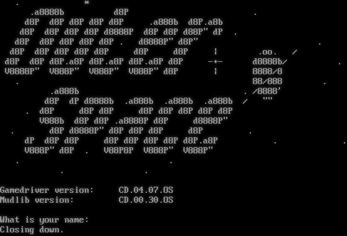 . \* .a8888b d8P . d8P d8P d8P d8P d8P .a888b d8P.a8b d8P d8P d8P d8P d8888P d8P d8P d88P" dP . d8P d8P d8P d8P d8P . d8888P" d8P" . d8P d8P d8P d8P d8P d8P d8P \| .oo. / d8P d8P d8P.a8P d8P.a8P d8P.a8P d8P -+- d8888b/ . V8888P" V888P" V888P" V888P" d8P \| 8888/8 . 88/888 . .a888b . /8888' d8P dP d8888b .a888b .a888b .a888b / "" . d8P d8P d8P d8P d8P d8P d8P d8P V888b d8P d8P .a8888P d8P d8888P" . d8P d8888P" d8P d8P d8P d8P . dP d8P d8P d8P d8P d8P d8P d8P.a8P . . V888P" d8P . V88P8P V888P" V888P" . . . . Gamedriver version: CD.04.07.OS Mudlib version: CD.00.30.OS What is your name: Closing down.