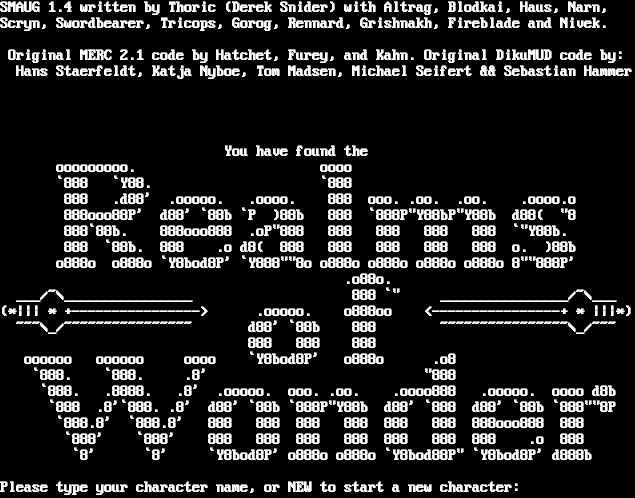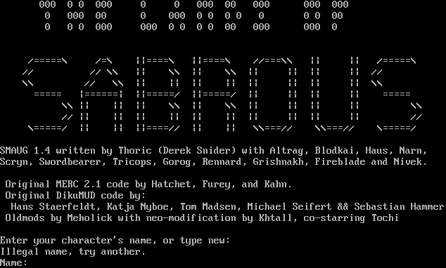 000 0 0 000 0 0 000 00 000 000 000 0 000 00 0 000 0 0 0 0 0 0 0 00 0 0 0 000 000 0 0 0 0 00 000 000 0 /=​====\\ /=\\ \|\|=​===\\ \|\|=​===\\ //===\\\\ \|\| \|\| /=​====\\ // // \\\\ \|\| \\\\ \|\| \\\\ \|\| \|\| \|\| \|\| // \\\\ // \\\\ \|\| \|\| \|\| \|\| \|\| \|\| \|\| \|\| \\\\ =​==== \|=​=====\| \|\|=​====/ \|\|=​====/ \|\| \|\| \|\| \|\| =​==== \\\\ \|\| \|\| \|\| \\\\ \|\| \\\\ \|\| \|\| \|\| \|\| \\\\ // \|\| \|\| \|\| \|\| \|\| \|\| \|\| \|\| \|\| \|\| // \\=​====/ \|\| \|\| \|\|=​===// \|\| \|\| \\\\===// \\\\===// \\=​====/ SMAUG 1.4 written by Thoric (Derek Snider) with Altrag, Blodkai, Haus, Narn, Scryn, Swordbearer, Tricops, Gorog, Rennard, Grishnakh, Fireblade and Nivek. Original MERC 2.1 code by Hatchet, Furey, and Kahn. Original DikuMUD code by: Hans Staerfeldt, Katja Nyboe, Tom Madsen, Michael Seifert && Sebastian Hammer Oldmods by Meholick with neo-modification by Khtall, co-starring Tochi Enter your character's name, or type new: Illegal name, try another. Name: