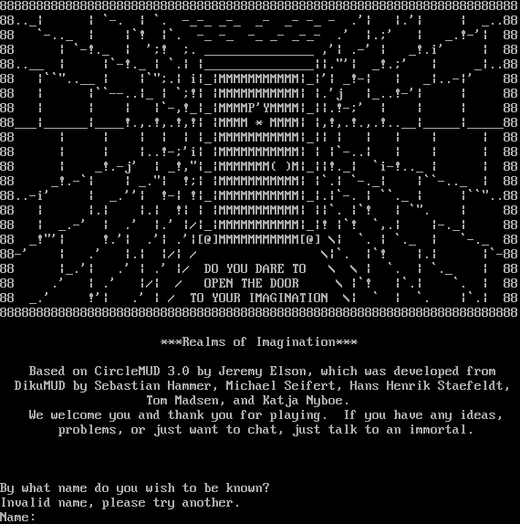 88888888888888888888888888888888888888888888888888888888888888888888888 88.._\| \| \`-. \| \`. -​_-_ _-_ _- _- -_ - .'\| \|.'\| \| _..88 88 \`-​.._ \| \|\`! \|\`. -_ -_ -_ _- _​-_- .' \|.;' \| _.!-'\| 88 88 \| \`-!._ \| ';! ;. _​______________ ,'\| .-' \| _!.i' \| 88 88.​.__ \| \|\`-!._ \| \`.\| \|_​______________\|\|."'\| _!.;' \| _\|..88 88 \|\`\`"​..__ \| \|\`";.\| i\|_\|MMMMMMMMMMM\|_\|'\| _!-\| \| _\|..-\|' 88 88 \| \|\`\`-​-..\|_ \| \`;!\| \|MMMMMMMMMMM\| \|.'j \|_..!-'\| \| 88 88 \| \| \| \|\`-,!_\|_\|MMMMP'YMMMM\|_\|\|.!-;' \| \| \| 88 88___\|_​_____\|_​___!.,.!,.!,!\| \|MMMM \* MMMM\| \|,!,.!.,.!.​.__\|_​____\|_​____88 88 \| \| \| \| \| \|_\|MMMMMMMMMMM\|_\|\| \| \| \| \| \| 88 88 \| \| \|..!-;'i\| \|MMMMMMMMMMM\| \| \|\`-..\| \| \| \| 88 88 \| _!.-j' \| _!,"\|_\|MMMMMMM( )M\|_\|\|!._\| \`i-!.._ \| \| 88 88 _!.-\`\| \| _."\| !;\| \|MMMMMMMMMMM\| \|\`.\| \`-._\| \|\`\`-​.._ \| 88 88..-i' \| _.''\| !-\| !\|_\|MMMMMMMMMMM\|_\|.\|\`-. \| \`\`._ \| \|\`\`"..88 88 \| \|.\| \|.\| !\| \| \|MMMMMMMMMMM\| \|\|\`. \|\`! \| \`". \| 88 88 \| _.-' \| .' \|.' \|/\|_\|MMMMMMMMMMM\|_\|! \|\`! \`,.\| \|-._\| 88 88 _!"'\| !.'\| .'\| .'\|[@]MMMMMMMMMMM[@] \\\| \`. \| \`._ \| \`-._ 88 88-' \| .' \|.\| \|/\| / \\\|\`. \|\`! \|.\| \|\`-88 88 \|_.'\| .' \| .' \|/ DO YOU DARE TO \\ \\ \| \`. \| \`._ \| 88 88 .' \| .' \|/\| / OPEN THE DOOR \\ \|\`! \|\`.\| \`. \| 88 88 _.' !'\| .' \| / TO YOUR IMAGINATION \\\| \` \| \`. \|\`.\| 88 88888888888888888888888888888888888888888888888888888888888888888888888 \*\*\*Realms of Imagination\*\*\* Based on CircleMUD 3.0 by Jeremy Elson, which was developed from DikuMUD by Sebastian Hammer, Michael Seifert, Hans Henrik Staefeldt, Tom Madsen, and Katja Nyboe. We welcome you and thank you for playing. If you have any ideas, problems, or just want to chat, just talk to an immortal. By what name do you wish to be known? Invalid name, please try another. Name: