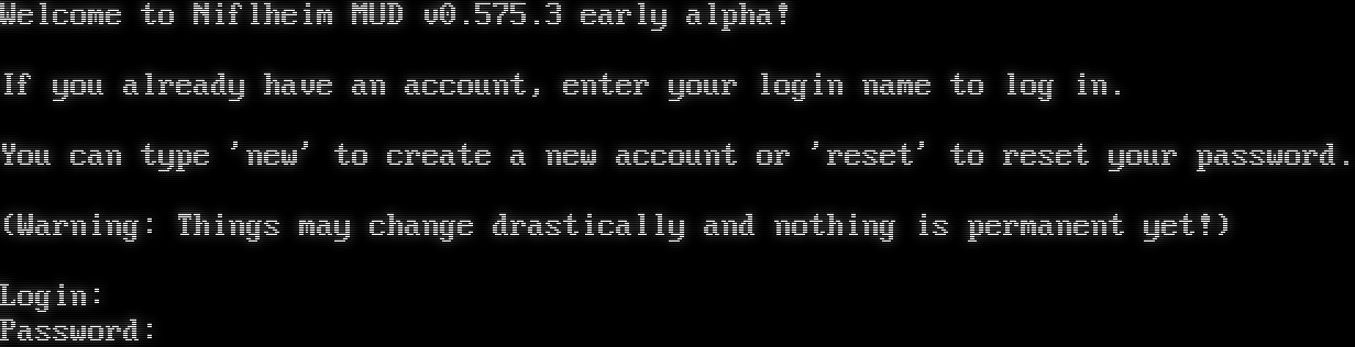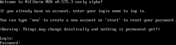 Welcome to Niflheim MUD v0.575.3 early alpha! If you already have an account, enter your login name to log in. You can type 'new' to create a new account or 'reset' to reset your password. (Warning: Things may change drastically and nothing is permanent yet!) Login: Password: