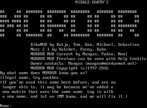MIDDLE-EARTH'S ## ## #​###### #​####### #​####### #​###### #​####### ### ### ## ## ## ## ## ## ## ## ## ## #​### #​### ## ## ## ## ## ## ## ## ## ## ## ### ## ## ## #​####### ## ## ## ## #​####### ## ## ## ## ## ## ## ## ## ## ## ## ## ## #​###### ## ## #​####### #​###### ## ## DikuMUD by Katja, Tom, Han, Michael, Sebastian Merc 2.1 by Hatchet, Furey, Kahn MORDOR MUD Current by Mangan, Padan, Noni MORDOR MUD Previous can be seen with Help Credits Owner contacts: Mangan <mangan@mordormud.net> MORDOR MUD Copyright (c)1997-2016 By what name does MORDOR know you as? Illegal name, try another. (If you've used this name here before, and are no longer able to, it may be because we've added a new mobile that uses the same name. Log in with a new name, and let an IMM know, and we will fix it.) Name: