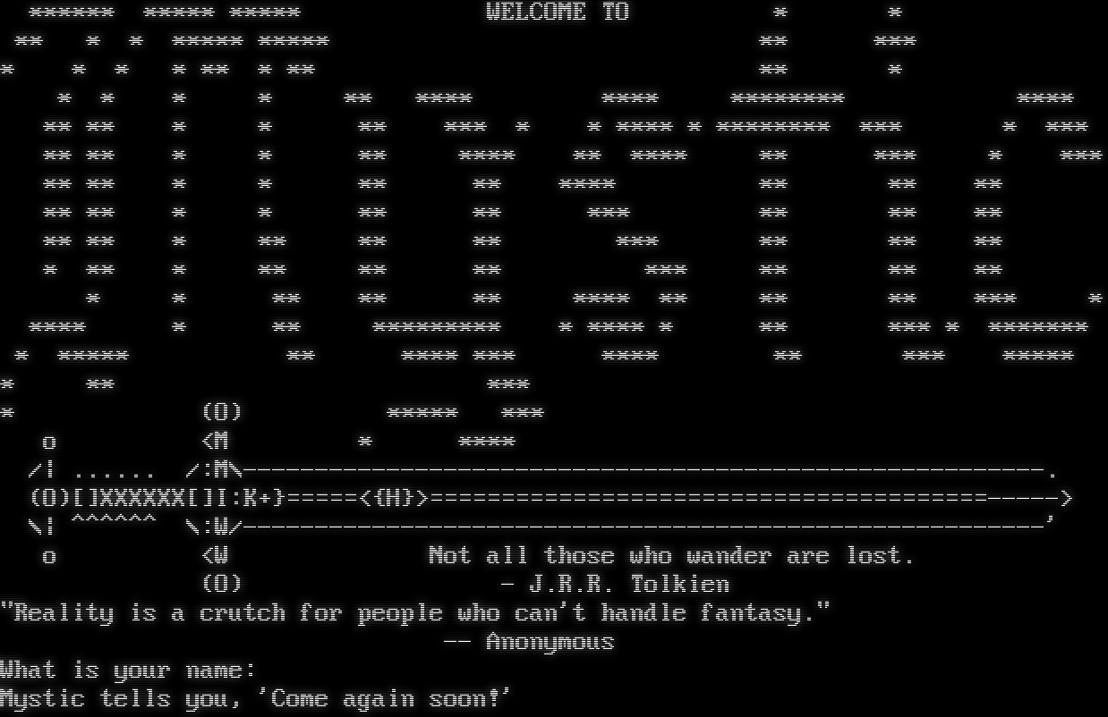 \*\*\*\*\*\* \*\*\*\*\* \*\*\*\*\* WELCOME TO \* \* \*\* \* \* \*\*\*\*\* \*\*\*\*\* \*\* \*\*\* \* \* \* \* \*\* \* \*\* \*\* \* \* \* \* \* \*\* \*\*\*\* \*\*\*\* \*\*\*\*\*\*\*\* \*\*\*\* \*\* \*\* \* \* \*\* \*\*\* \* \* \*\*\*\* \* \*\*\*\*\*\*\*\* \*\*\* \* \*\*\* \*\* \*\* \* \* \*\* \*\*\*\* \*\* \*\*\*\* \*\* \*\*\* \* \*\*\* \*\* \*\* \* \* \*\* \*\* \*\*\*\* \*\* \*\* \*\* \*\* \*\* \* \* \*\* \*\* \*\*\* \*\* \*\* \*\* \*\* \*\* \* \*\* \*\* \*\* \*\*\* \*\* \*\* \*\* \* \*\* \* \*\* \*\* \*\* \*\*\* \*\* \*\* \*\* \* \* \*\* \*\* \*\* \*\*\*\* \*\* \*\* \*\* \*\*\* \* \*\*\*\* \* \*\* \*\*\*\*\*\*\*\*\* \* \*\*\*\* \* \*\* \*\*\* \* \*\*\*\*\*\*\* \* \*\*\*\*\* \*\* \*\*\*\* \*\*\* \*\*\*\* \*\* \*\*\* \*\*\*\*\* \* \*\* \*\*\* \* (O) \*\*\*\*\* \*\*\* o <M \* \*\*\*\* /\| .​..... /:M\\-​-------------------------------------------------------. (O)[]XXXXXX[]I:K+}=​====<{H}>=​======================================-----> \\\| ^​^^^^^ \\:W/-​-------------------------------------------------------' o <W Not all those who wander are lost. (O) - J.R.R. Tolkien "Reality is a crutch for people who can't handle fantasy." -- Anonymous What is your name: Mystic tells you, 'Come again soon!'