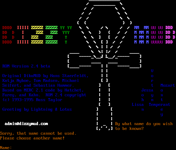 _​____________ / _​________ \\ / / \\ \\ / / \\ \\ / / \\ \\ ( ( ) ) DDDD IIIII ZZZZZ ZZZZZ YY YY \\ \\ / \\ / / MM MM UU UU DDD DD D I ZZZ ZZZ YYY \\ \\ ) ( / / M MM M UU UU DD D DD D I ZZZ ZZZ Y \\ \\ ] [ / / M MM M UU UU DD D DDDD IIIII ZZZZZ ZZZZZ Y \\ \\ [ ] / / M MM M UUUUU DDD \\ \\ \| \| / / _​___ \\ \\\| \|/ / _​___ [ -​----_\\__J L__/_​----- ] [ _​___ _​___ ] ROM Version 2.4 beta [_​___----- \| \| -​----____] \| \| V Original DikuMUD by Hans Staerfeldt, \| \| o Katja Nyboe, Tom Madsen, Michael [ ] r Seifert, and Sebastian Hammer. ] [ t Mozart Based on MERC 2.1 code by Hatchet, \| \| Jessa o Furey, and Kahn. ROM 2.4 copyright \| \| o y n (c) 1993-1995 Russ Taylor \| \| h n t [ ] Lissa Temperant Greeting by Lightning & Lotus ] [ n e \| \| y \| \| admin@dizzymud.com \| _ \| By what name do you wish [,' ',] to be known? Sorry, that name cannot be used. Please choose another name! Name: