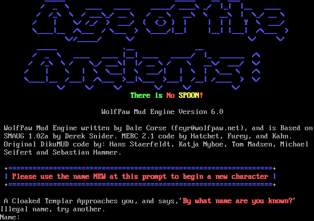 _​____ _​____ __ ___ / _ \\ _​___ _​___ _​____/ _​___\\ _/ \|_\| \|__ _​___ / /_\\ \\ / ___\\_/ __ \\ / _ \\ __\\ \\ __\\ \| \\_/ __ \\ / \| \\/ /_/ > ___/ ( <_> ) \| \| \| \| Y \\ ___/ \\_​___\|__ /\\___ / \\___ > \\_​___/\|__\| \|__\| \|___\| /\\___ > \\//_​____/ \\/ \\/ \\/ _​____ .__ __ / _ \\ _​___ _​___ \|__\| _​___ _​____/ \|_ _​_____ /\\ / /_\\ \\ / \\_/ ___\\\| \|/ __ \\ / \\ __\\/ ___/ \\/ / \| \\ \| \\ \\___\| \\ ___/\| \| \\ \| \\___ \\ /\\ \\_​___\|__ /___\| /\\___ >__\|\\___ >___\| /__\| /_​___ > \\/ \\/ \\/ \\/ \\/ \\/ \\/ There is No SPOON! WolfPaw Mud Engine Version 6.0 WolfPaw Mud Engine written by Dale Corse (feyr@wolfpaw.net), and is Based on SMAUG 1.02a by Derek Snider. MERC 2.1 code by Hatchet, Furey, and Kahn. Original DikuMUD code by: Hans Staerfeldt, Katja Nyboe, Tom Madsen, Michael Seifert and Sebastian Hammer. +​=================================================================+ \| Please use the name NEW at this prompt to begin a new character \| +​=================================================================+ A Cloaked Templar Approaches you, and says,'By what name are you known?' Illegal name, try another. Name:
