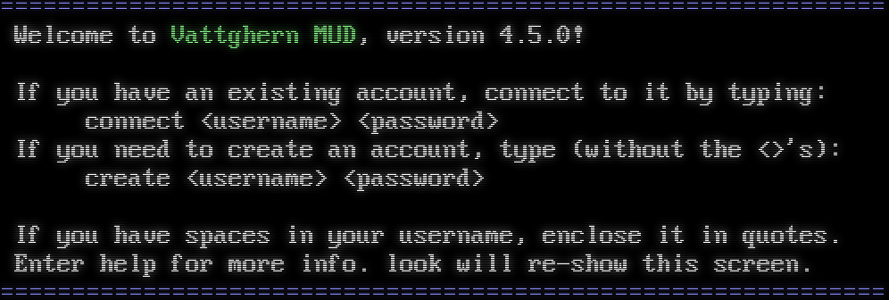 =​============================================================= Welcome to Vattghern MUD, version 4.5.0! If you have an existing account, connect to it by typing: connect &lt;username&gt; &lt;password&gt; If you need to create an account, type (without the &lt;&gt;'s): create &lt;username&gt; &lt;password&gt; If you have spaces in your username, enclose it in quotes. Enter help for more info. look will re-show this screen. =​=============================================================