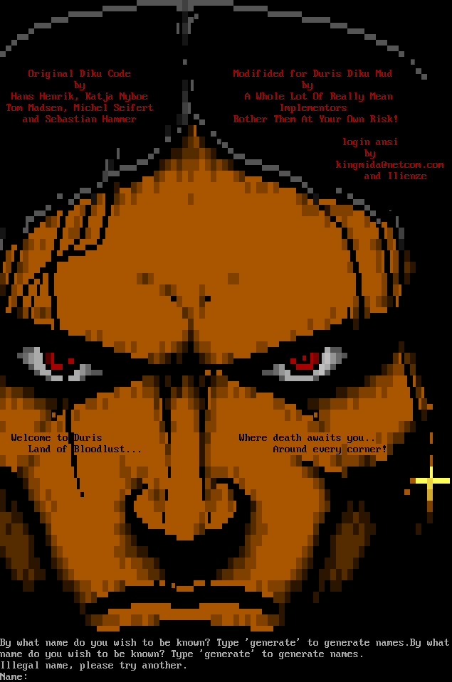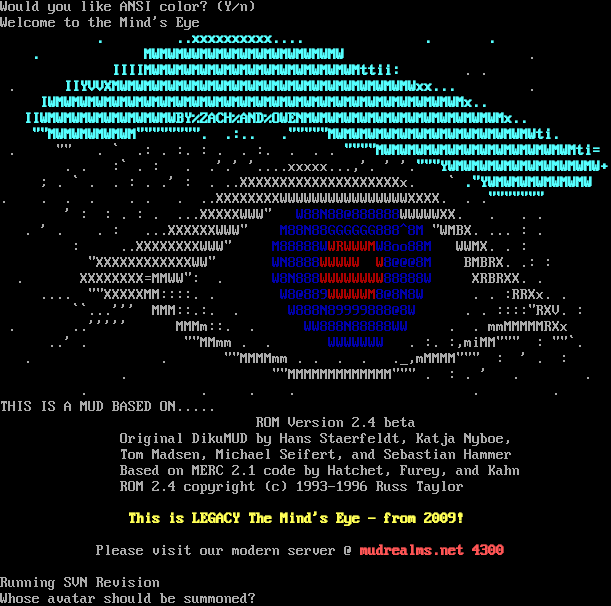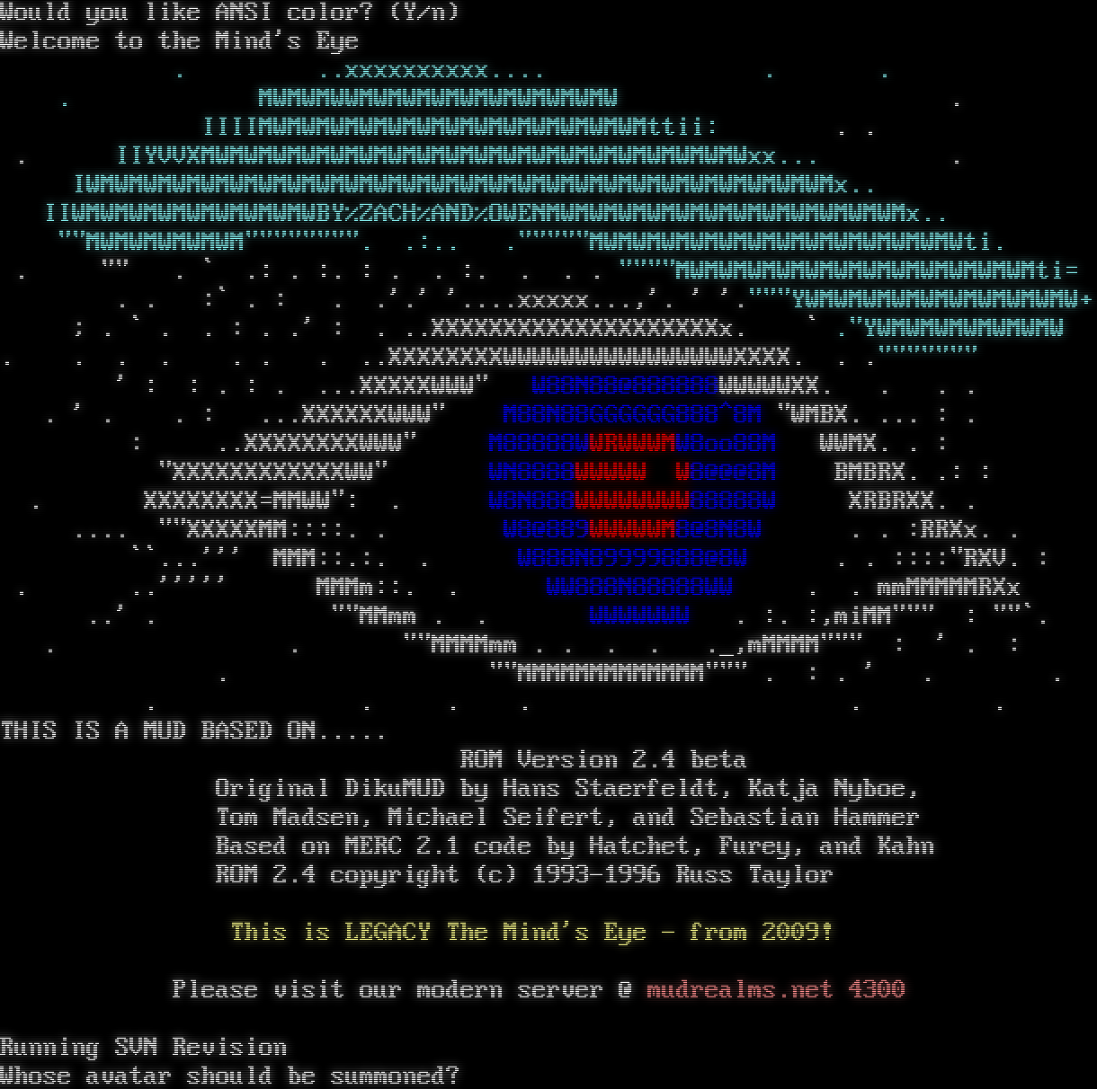 Would you like ANSI color? (Y/n) Welcome to the Mind's Eye . ..xxxxxxxxxx.​... . . . MWMWMWWMWMWMWMWMWMWMWMWMW . IIIIMWMWMWMWMWMWMWMWMWMWMWMWMWMttii: . . . IIYVVXMWMWMWMWMWMWMWMWMWMWMWMWMWMWMWMWMWMWMWxx... . IWMWMWMWMWMWMWMWMWMWMWMWMWMWMWMWMWMWMWMWMWMWMWMWMWMWMx.. IIWMWMWMWMWMWMWMWMWBY%ZACH%AND%OWENMWMWMWMWMWMWMWMWMWMWMWMWMx.. ""MWMWMWMWMWM"​""""""". .:.. .​"""""MWMWMWMWMWMWMWMWMWMWMWMWMWti. . "" . \` .: . :. : . . :. . . . "​"""MWMWMWMWMWMWMWMWMWMWMWMWMti= . . :\` . : . .'.' '.​...xxxxx...,'. ' '.​"""YWMWMWMWMWMWMWMWMWMW+ ; . \` . . : . .' : . ..XXXXXXXXXXXXXXXXXXXXx. \` ."YWMWMWMWMWMWMW . . . . . . . ..XXXXXXXXWWWWWWWWWWWWWWWWXXXX. . .​""""""" ' : : . : . ...XXXXXWWW" W88N88@888888WWWWWXX. . . . . ' . . : ...XXXXXXWWW" M88N88GGGGGG888^8M "WMBX. ... : . : ..XXXXXXXXWWW" M88888WWRWWWMW8oo88M WWMX. . : "XXXXXXXXXXXXWW" WN8888WWWWW W8@@@8M BMBRX. .: : . XXXXXXXX=MMWW": . W8N888WWWWWWWW88888W XRBRXX. . .​... ""XXXXXMM::::. . W8@889WWWWWM8@8N8W . . :RRXx. . \`\`...''' MMM::.:. . W888N89999888@8W . . ::::"RXV. : . ..''''' MMMm::. . WW888N88888WW . . mmMMMMMRXx ..' . ""MMmm . . WWWWWWW . :. :,miMM""" : ""\`. . . ""MMMMmm . . . . ._,mMMMM""" : ' . : . ""MMMMMMMMMMMMM""" . : . ' . . . . . . . . THIS IS A MUD BASED ON.​.... ROM Version 2.4 beta Original DikuMUD by Hans Staerfeldt, Katja Nyboe, Tom Madsen, Michael Seifert, and Sebastian Hammer Based on MERC 2.1 code by Hatchet, Furey, and Kahn ROM 2.4 copyright (c) 1993-1996 Russ Taylor This is LEGACY The Mind's Eye - from 2009! Please visit our modern server @ mudrealms.net 4300 Running SVN Revision Whose avatar should be summoned?