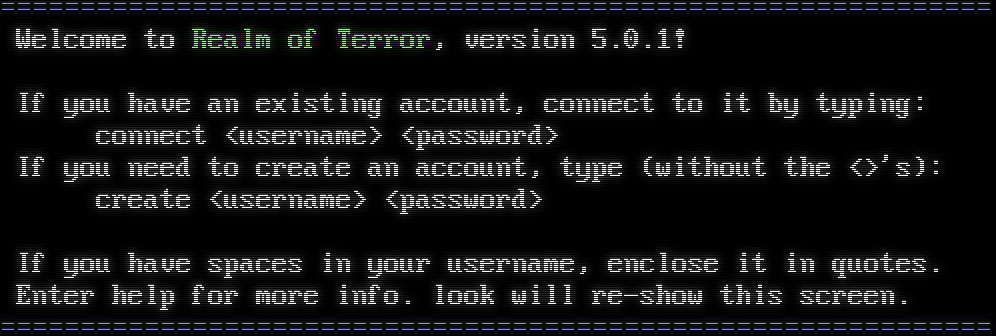 =​============================================================= Welcome to Realm of Terror, version 5.0.1! If you have an existing account, connect to it by typing: connect &lt;username&gt; &lt;password&gt; If you need to create an account, type (without the &lt;&gt;'s): create &lt;username&gt; &lt;password&gt; If you have spaces in your username, enclose it in quotes. Enter help for more info. look will re-show this screen. =​=============================================================