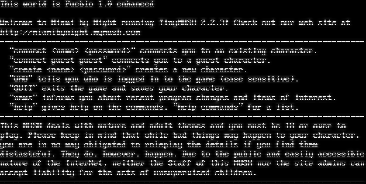 This world is Pueblo 1.0 enhanced Welcome to Miami by Night running TinyMUSH 2.2.3! Check out our web site at http://miamibynight.mymush.com -​----------------------------------------------------------------------------- "connect <name> <password>" connects you to an existing character. "connect guest guest" connects you to a guest character. "create <name> <password>" creates a new character. "WHO" tells you who is logged in to the game (case sensitive). "QUIT" exits the game and saves your character. "news" informs you about recent program changes and items of interest. "help" gives help on the commands, "help commands" for a list. -​----------------------------------------------------------------------------- This MUSH deals with mature and adult themes and you must be 18 or over to play. Please keep in mind that while bad things may happen to your character, you are in no way obligated to roleplay the details if you find them distasteful. They do, however, happen. Due to the public and easily accessible nature of the InterNet, neither the Staff of this MUSH nor the site admins can accept liability for the acts of unsupervised children. -​-----------------------------------------------------------------------------