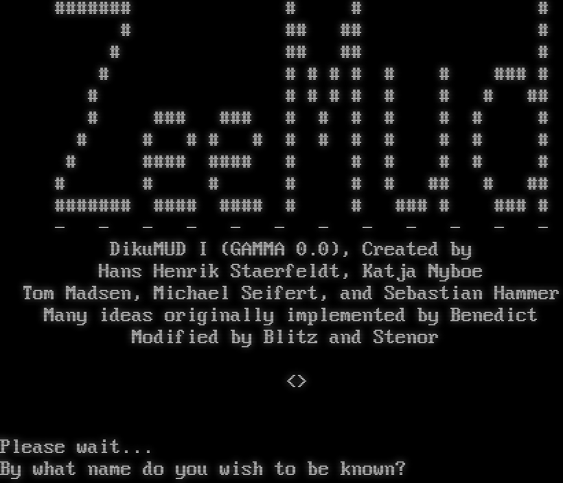 #​###### # # # # ## ## # # ## ## # # # # # # # # ### # # # # # # # # # ## # ### ### # # # # # # # # # # # # # # # # # # # # #​### #​### # # # # # # # # # # # # ## # ## #​###### #​### #​### # # ### # ### # - - - - - - - - - - - - DikuMUD I (GAMMA 0.0), Created by Hans Henrik Staerfeldt, Katja Nyboe Tom Madsen, Michael Seifert, and Sebastian Hammer Many ideas originally implemented by Benedict Modified by Blitz and Stenor <> Please wait... By what name do you wish to be known?