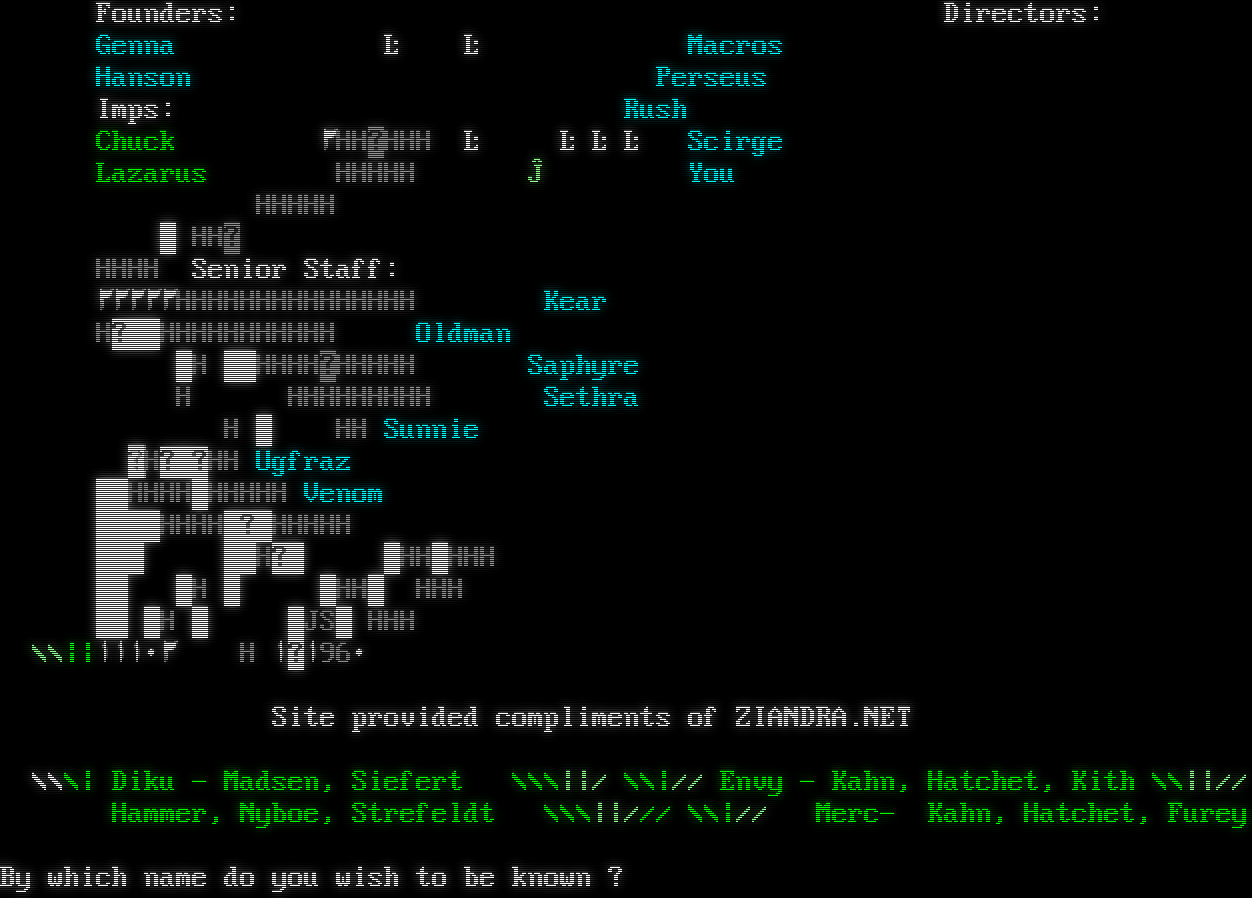 Founders: Directors: Genna Ŀ ĿMacros Hanson Perseus Imps: Rush Chuck۲HHɻHHH Ŀ Ŀ Ŀ Ŀ Scirge Lazarus HHHHH Ĵ You HHHHH HHȼ HHHH Senior Staff: ۲۲۲۲۲HHHHHHHHHHHHHHHKear Hͻ HHHHHHHHHHH   Oldman H HHHHͻHHHHH Saphyre H HHHHHHHHH Sethra 444H 4444HHSunnie ͼHͼ ͼHH Ugfraz       HHHH HHHHH Venom       HHHH ͻ HHHHH Hͻ HH HHH H HH HHH H JS HHH \\\\\|\|۱۱۱۰۲ H ۱ͼ۱96۰ Site provided compliments of ZIANDRA.NET \\\\\\\| Diku - Madsen, Siefert \\\\\\\|\|/ \\\\\|// Envy - Kahn, Hatchet, Kith \\\\\|\|// Hammer, Nyboe, Strefeldt \\\\\\\|\|/// \\\\\|// Merc- Kahn, Hatchet, Furey By which name do you wish to be known ?