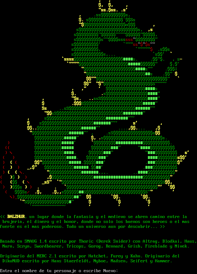 . , , $, $, , "ss.$ss. .s' , .ss$$$$$$$$$$s, $. s$$$$$$$$$$$$$$\`$$Ss "$$$$$$$$$$$$$$$$$$o$$$ , s$$$$$$$$$$$$$$$$$$$$$$$$s, ,s s$$$$$$$$$"$$$$$$"​"""$$$$$$"$$$$$, s$$$$$$$$$$s""$$$$ssssss"$$$$$$$$" s$$$$$$$$$$' \`"""ss"$"$s"" s$$$$$$$$$$, \`"​""""$ .s$$s s$$$$$$$$$$$$s,... \`s$$' \` \`ssss$$$$$$$$$$$$$$$$$$$$#​###s. .$$"$. , s- \`"​"""$$$$$$$$$$$$$$$$$$$$#​####$$$$$$" $.$' "$$$$$$$$$$$$$$$$$$$$$#​###s"" .$$$\| "$$$$$$$$$$$$$$$$$$$$$$$$##s .$$" $ $$""$$$$$$$$$$$$$$$$$$$$$$$$$$$$$" \` $$" "$"$$$$$$$$$$$$$$$$$$$$S"​"""' , ," ' $$$$$$$$$$$$$$$$#​###s $. .s$$$$$$$$$$$$$$$$$#​###" , "$s. ..ssS$$$$$$$$$$$$$$$$$$$#​###" $ .$$$S$$$$$$$$$$$$$$$$$$$$$$$$#​####" Ss ..sS$$$$$$$$$$$$$$$$$$$$$$$$$$$#​#####"" "$$sS$$$$$$$$$$$$$$$$$$$$$$$$$$$#​#######" , s$$$$$$$$$$$$$$$$$$$$$$$$#​########""' $ s$$$$$$$$$$$$$$$$$$$$$#​######""' s' , $$..$$$$$$$$$$$$$$$$$$#​#####"' .​...,$$.​... ,$ "$$$$$$$$$$$$$$$#​#####"' , .sS$$$$$$$$$$$$$$$$s$$ $$$$$$$$$$$$#​####" $, .s$$$$$$$$$$$$$$$$$$$$$$$$s. ) $$$$$$$$$$$#​####' \`$$$$$$$$$#​##########$$$$$$$$$$$. (( $$$$$$$$$$$#​#### $$$$$$$$#​##" "​####$$$$$$$$$$ ) \\ $$$$$$$$$$$$#​###. $$$$$$#​##" "​###$$$$$$$$$ s' ( ) $$$$$$$$$$$$$#​###. $$$$$#​##" #​###$$$$$$$$s$$' ) ( ( $$"$$$$$$$$$$$#​####.$$$$$###' .​###$$$$$$$$$$" ( ) ) _,$" $$$$$$$$$$$$#​#####.$$##' .​###$$$$$$$$$$ ) ( ( \\. "$$$$$$$$$$$$$#​######,,,. .​.####$$$$$$$$$$$" ( )$ ) ) ,$$$$$$$$$$$$$$$$$$#​###################$$$$$$$$$$$" ( ($$ ( \\ _sS" \`"$$$$$$$$$$$$$$$$$$$$$$$$$$$$$$$$$$$$$$$$$S$$, ) )$$$s ) ) . . \`$$$$$$$$$$$$$$$$$$$$$$$$$$$$$$$$$$$$$"' \`$$ ( $$$Ss/ .$, .$,,s$$$$$$##S$$$$$$$$$$$$$$$$$$$$$$$$S"" ' \\)_$$$$$$$$$$$$$$$$$$$$$$$##" $$ \`$$. \`$$. \`"S$$$$$$$$$$$$$$$$$#" $ \`$ \`$ \`"​""""""""""""' ' ' ' << BALZHUR, un lugar donde la fantasia y el medievo se abren camino entre la brujeria, el dinero y el honor, donde no solo los buenos son heroes o el mas fuerte es el mas poderoso. Todo un universo aun por descubrir... >> Basado en SMAUG 1.4 escrito por Thoric (Derek Snider) con Altrag, Blodkai, Haus, Narn, Scryn, Swordbearer, Tricops, Gorog, Rennard, Grish, Fireblade y Nivek. Originario del MERC 2.1 escrito por Hatchet, Furey y Kahn. Originario del DikuMUD escrito por Hans Staerfeldt, Nyboe, Madsen, Seifert y Hammer. Entra el nombre de tu personaje o escribe Nuevo: <!-- Set up MXP elements --><!ELEMENT Ex '<send>' FLAG=RoomExit> Nombre ilegal, prueba con otro. Nombre: