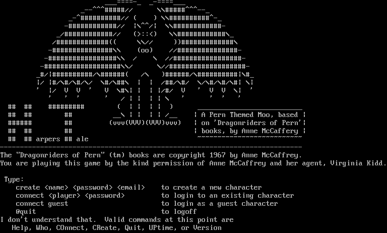 _​__====-_ _​-====___ _​--^^^#####// \\\\#​####^^^--_ _​-^##########// ( ) \\\\#​#########^-_ -​############// \|\\^^/\| \\\\#​###########- _/#​###########// (>::<) \\\\#​###########\\_ /#​############(( \\\\// ))#​############\\ -​###############\\\\ (oo) //#​##############- -​#################\\\\ / \\ //#​################- -​###################\\\\/ \\//#​##################- _#/\|#​#########/\\#​#####( /\\ )#​#####/\\#​#########\|\\#_ \|/ \|#/\\#/\\#/\\/ \\#/\\##\\ \| \| /##/\\#/ \\/\\#/\\#/\\#\| \\\| ' \|/ V V ' V \\#\\\| \| \| \|/#/ V ' V V \\\| ' ' ' ' ' / \| \| \| \| \\ ' ' ' ' ## ## #​######## ( \| \| \| \| ) _​_________________________ ## ## ## __\\ \| \| \| \| /__ \| A Pern Themed Moo, based \| #​##### ## (vvv(VVV)(VVV)vvv) \| on 'Dragonriders of Pern'\| ## ## ## \| books, by Anne McCaffery \| ## ## arpers ## ale ~​~~~~~~~~~~~~~~~~~~~~~~~~~ -​-------------------------------------------------------------------------- The "Dragonriders of Pern" (tm) books are copyright 1967 by Anne McCaffrey. You are playing this game by the kind permission of Anne McCaffrey and her agent, Virginia Kidd. Type: create <name> <password> <email> to create a new character connect <player> <password> to login to an existing character connect guest to login as a guest character @quit to logoff I don't understand that. Valid commands at this point are Help, Who, COnnect, CReate, Quit, UPtime, or Version