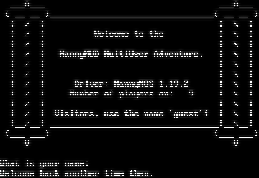 ___A___ ___A___ ( __ __ )_​________________________________( __ __ ) \| / \| \| \\ \| \| / \| Welcome to the \| \\ \| \| / \| \| \\ \| \| / \| NannyMUD MultiUser Adventure. \| \\ \| \| / \| \| \\ \| \| / \| \| \\ \| \| / \| Driver: NannyMOS 1.19.2 \| \\ \| \| / \| Number of players on: 9 \| \\ \| \| / \| \| \\ \| \| / \| Visitors, use the name 'guest'! \| \\ \| \|__/__\| _​_________________________________\|__\\__\| (___ ___) (___ ___) V V What is your name: Welcome back another time then.