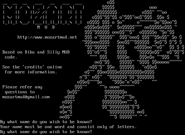 __ __ __ ___ __ ___ ___ o$$ \| \\/ \| / \\ \| _ \| / \\ \| \\\| \| $$$$$ ooo \| \|\| ) \|\|// /\| ) \|\| )\| \| \| $$$$$$$$ o$$$" ""oo \| \\/ \|\| \| / /\|\| \|\| / \| \| o$$$"$$"$$ o"$$$"oo$"$$$ $$o $ \|_\|\|_\| \\__/ \|___\|\|_\|\|_\|\|_\|_\\ \|_\| o$$$$ $$$ o $o" o"​"""""$o"$$oo"$ M U D o$$$o$o$$$" $o$$$$$""" oo$$$$$o$$$ " $$$"$$$$$$ ooo$$""$" o$$$$$o "$o"$$ http://www.mozartmud.net $$$ o"$$$$$" $$$"ooo$ $$$""$$o$$" $o $ "$$$ooo$$$$ $oo$$""$$$$$$ $o$"$ $"$ $ "$$"$$$$$" $$$ o$$$$oo""o$" $$ $ $ Based on Diku and Silly MUD $$"o$""$ $$$$ "$$$$$o$$" o$"$$"$ code. """ $$$ $$$$o $$$o$o ""$$$ "$ oo$"$$ $$$$$" "$$$$ $$ooooo"​"""" See the 'credits' online o$$"$" $$o $$$$$$ "o$$o$ for more information. o$"" $$oo$$$$o$$$$$$$$$o$$$$ o"$" o$$" "$$$$$$$"$$"$$$$$$$ o$$o$"""$o "$$$o"o"o$$" "" Please refer any $$$"" ""o oooo"​""""" questions to $o$$" $$$$$$$$o mozartmud@gmail.com o$$$ $"$$$$o$""$o o$$$" $$$$$$$$oo"" $ o$oo$ $$"$$$$$$$$"$"$ o$o"$ "$$$$$$$$$$ oo$ oo$$" ""$ $$$$$"" " " By what name do you wish to be known? Your name must be one word and consist only of letters. By what name do you wish to be known?
