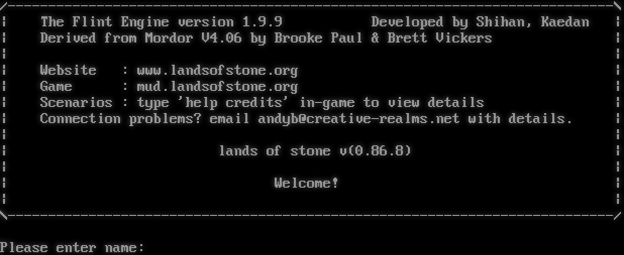 /-​--------------------------------------------------------------------------\\ \| The Flint Engine version 1.9.9 Developed by Shihan, Kaedan \| \| Derived from Mordor V4.06 by Brooke Paul & Brett Vickers \| \| \| \| Website : www.landsofstone.org \| \| Game : mud.landsofstone.org \| \| Scenarios : type 'help credits' in-game to view details \| \| Connection problems? email andyb@creative-realms.net with details. \| \| \| \| lands of stone v(0.86.8) \| \| \| \| Welcome! \| \| \| \\-​--------------------------------------------------------------------------/ Please enter name: